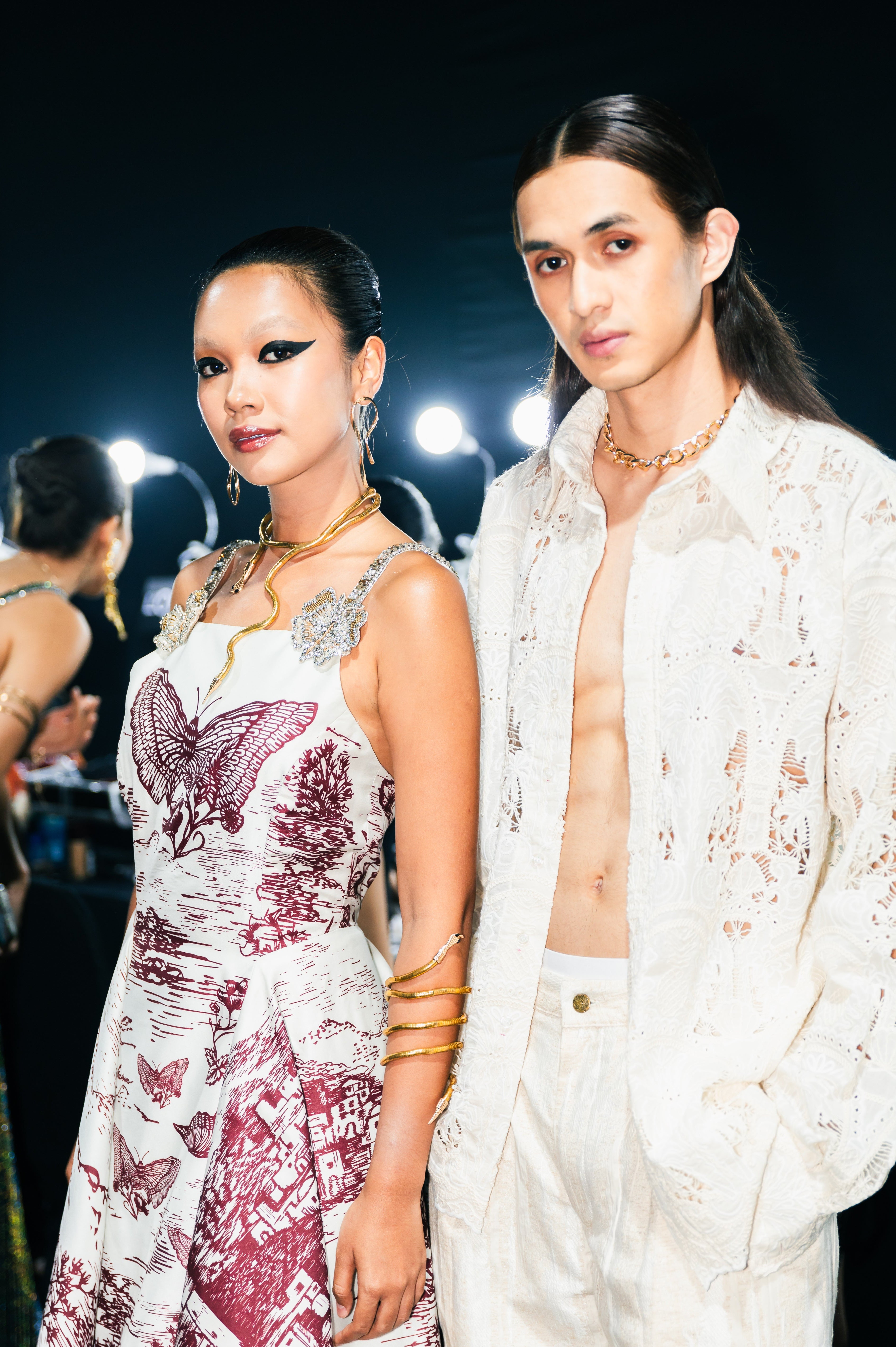 Earthy tones meet deep jewel shades, capturing both the softness of wings and the richness of the night sky. For women, metallic jacquard gowns and flowing silhouettes carry a sense of transformation; for men, denim, linen, and safari-inspired pieces speak of ease and adaptability.