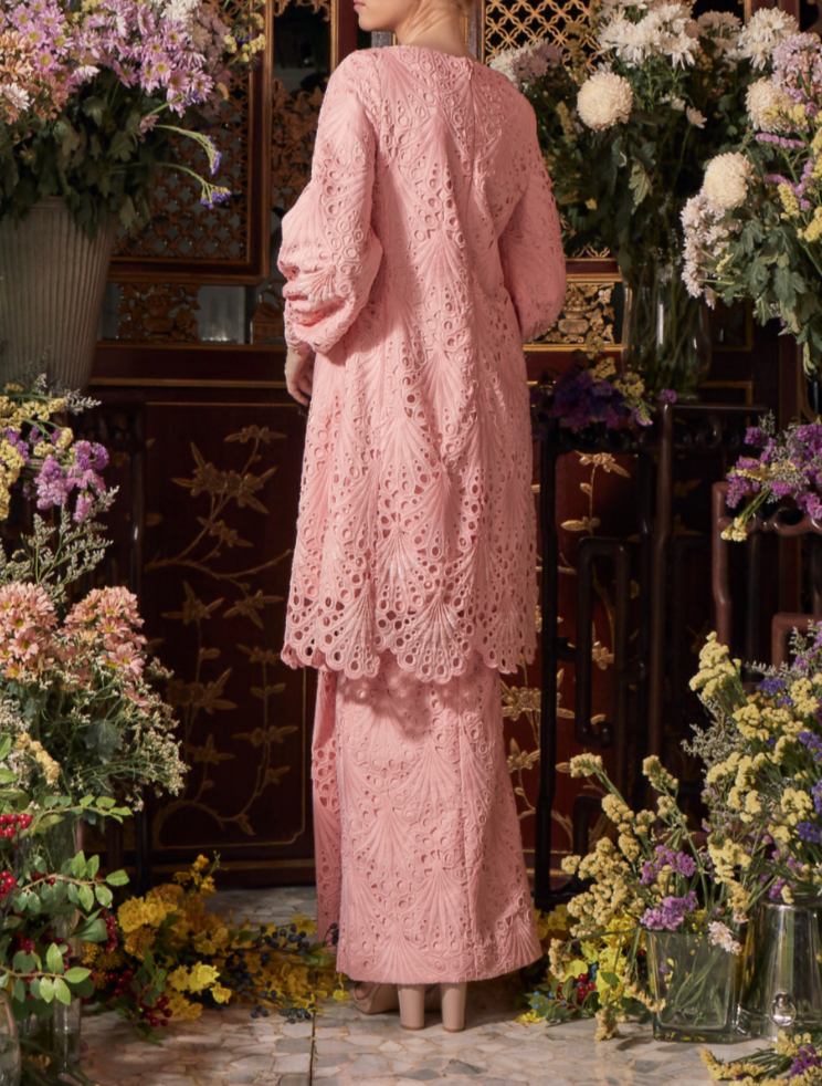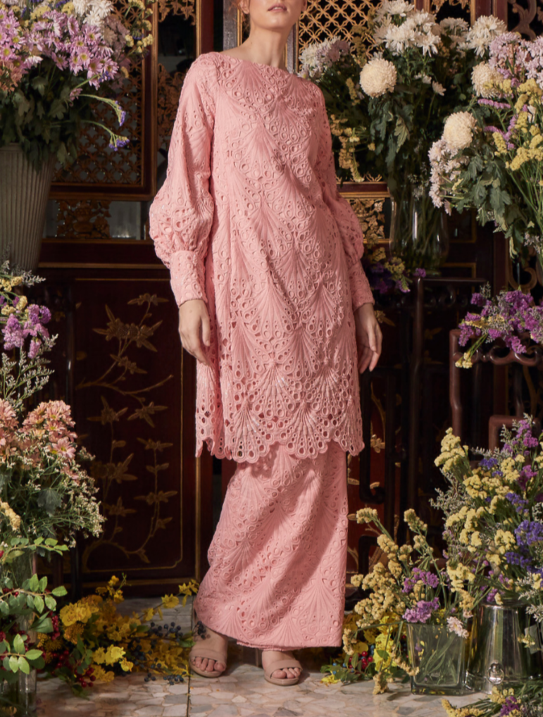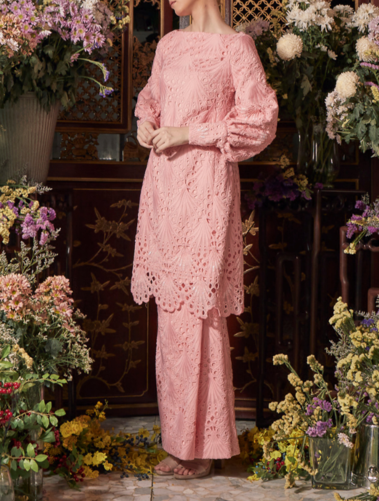 At the crossing of bright, bold colors, the elegance of pastel hues. An ode to freedom and play with the applique palm motifs on premium cotton lace combined with our signature in-house tambour beadwork. This collection emphasizes on voluminous sleeves, structured silhouette that has yielded this to be the most luxurious and streamline collection yet — this will definitely be a head turner for your festive Raya celebration.