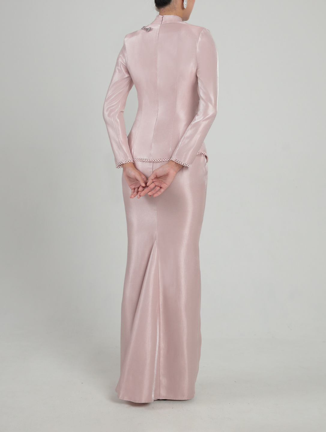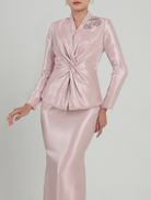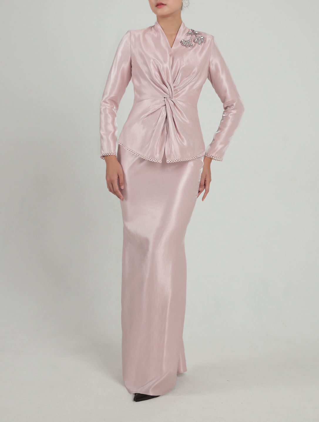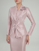 Amelia, a modern kebaya featuring a stand V-collar with twist-drape detailing. Designed with relaxed long sleeves, fagotting lace trims and floral beadwork at the shoulder. Paired with a fitted pencil skirt with rear godet inserts and elastic waistband. Partially lined for comfort and structure.