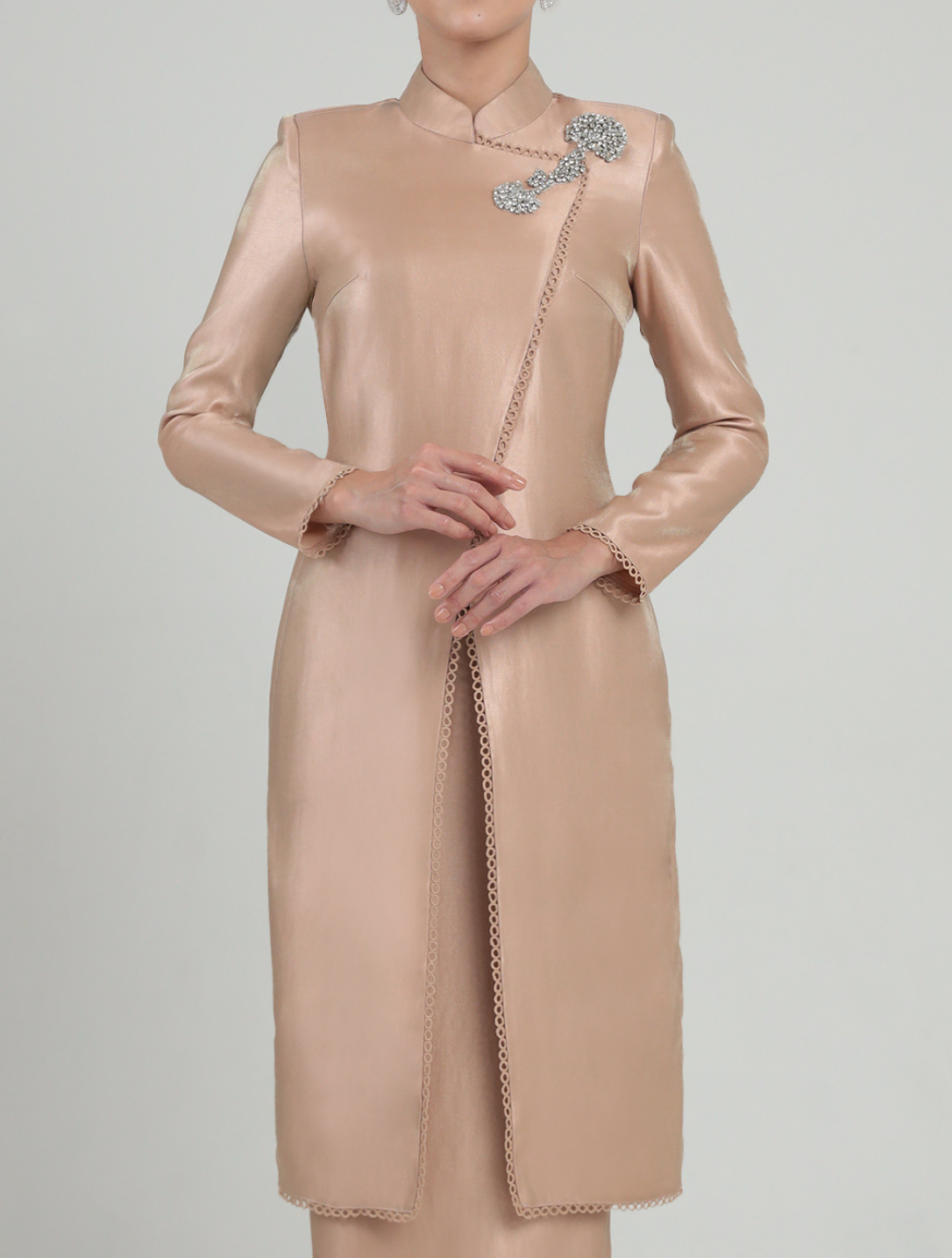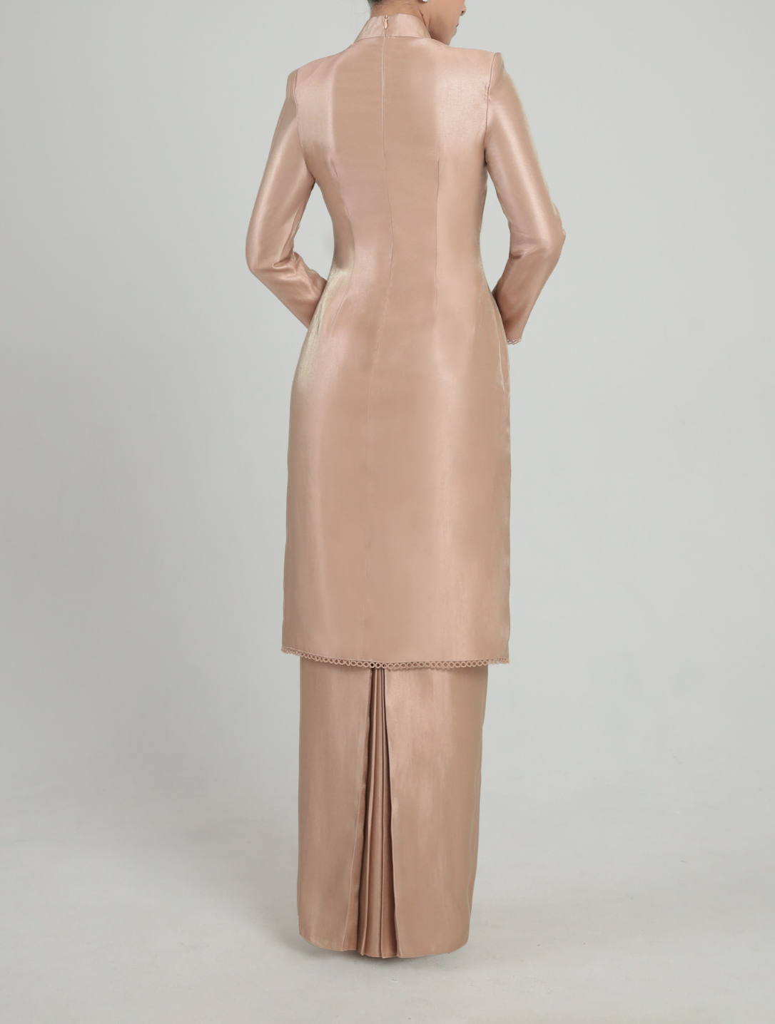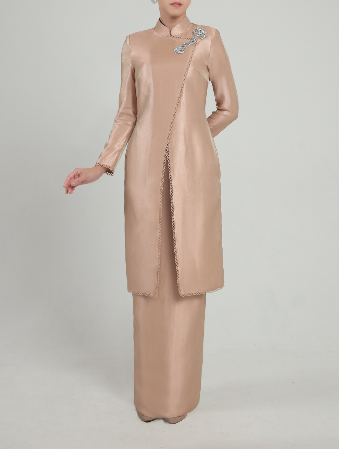 Amy, a classic Janggan long kebaya reinterpreted with a clean stand collar. Designed with fagotting lace trims, relaxed long sleeves and subtle shoulder structure. Finished with delicate shoulder beadwork and paired with a pencil skirt featuring a pleated back and elastic waistband. Unlined for ease of movement.