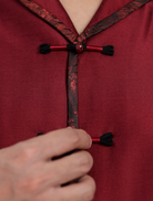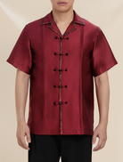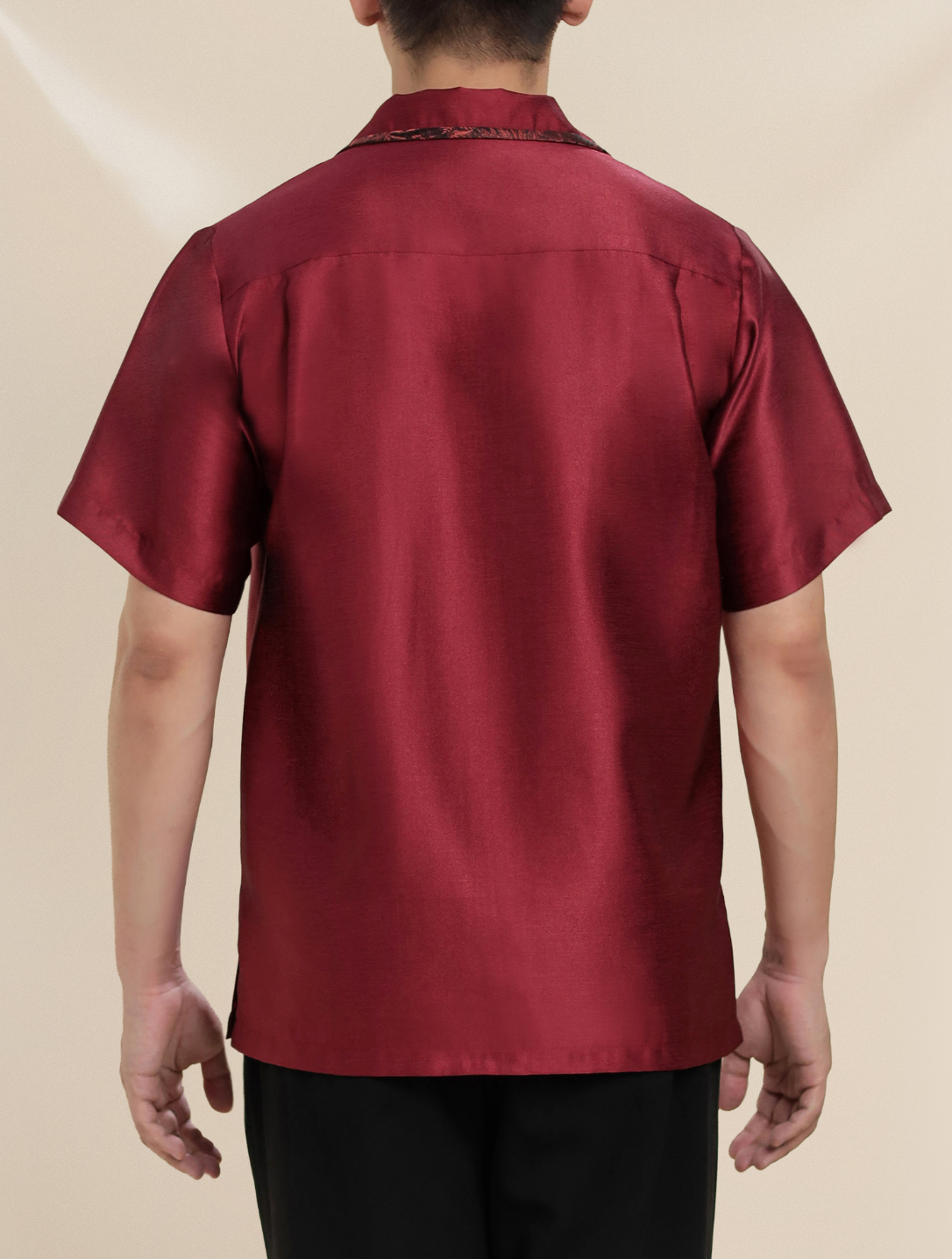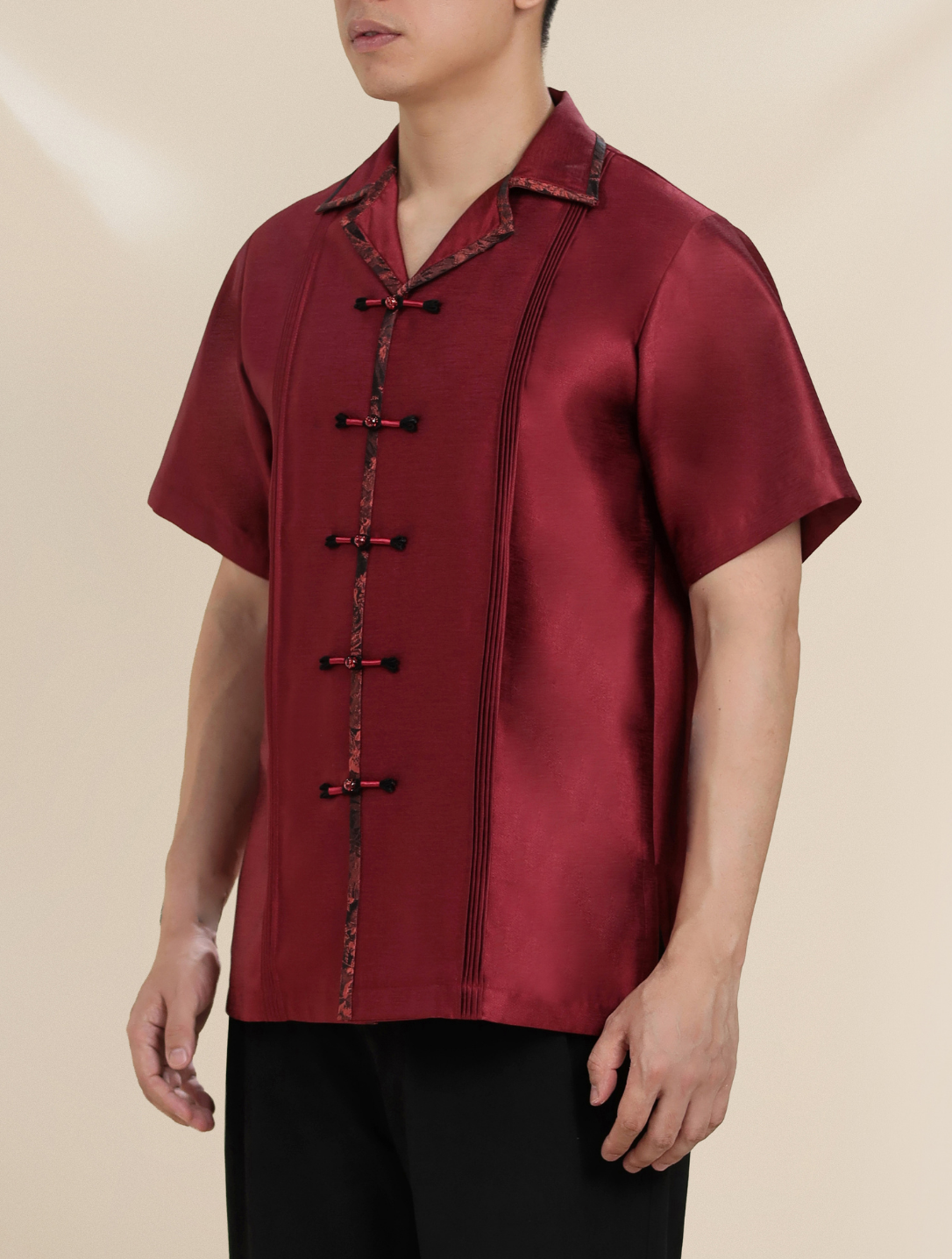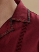 Andy in Maroon pairs a piped Hawaiian collar with short sleeves and crisp pintuck detailing. The front is finished with frog-button accents and a discreet snap closure, giving the piece a refined yet understated profile.