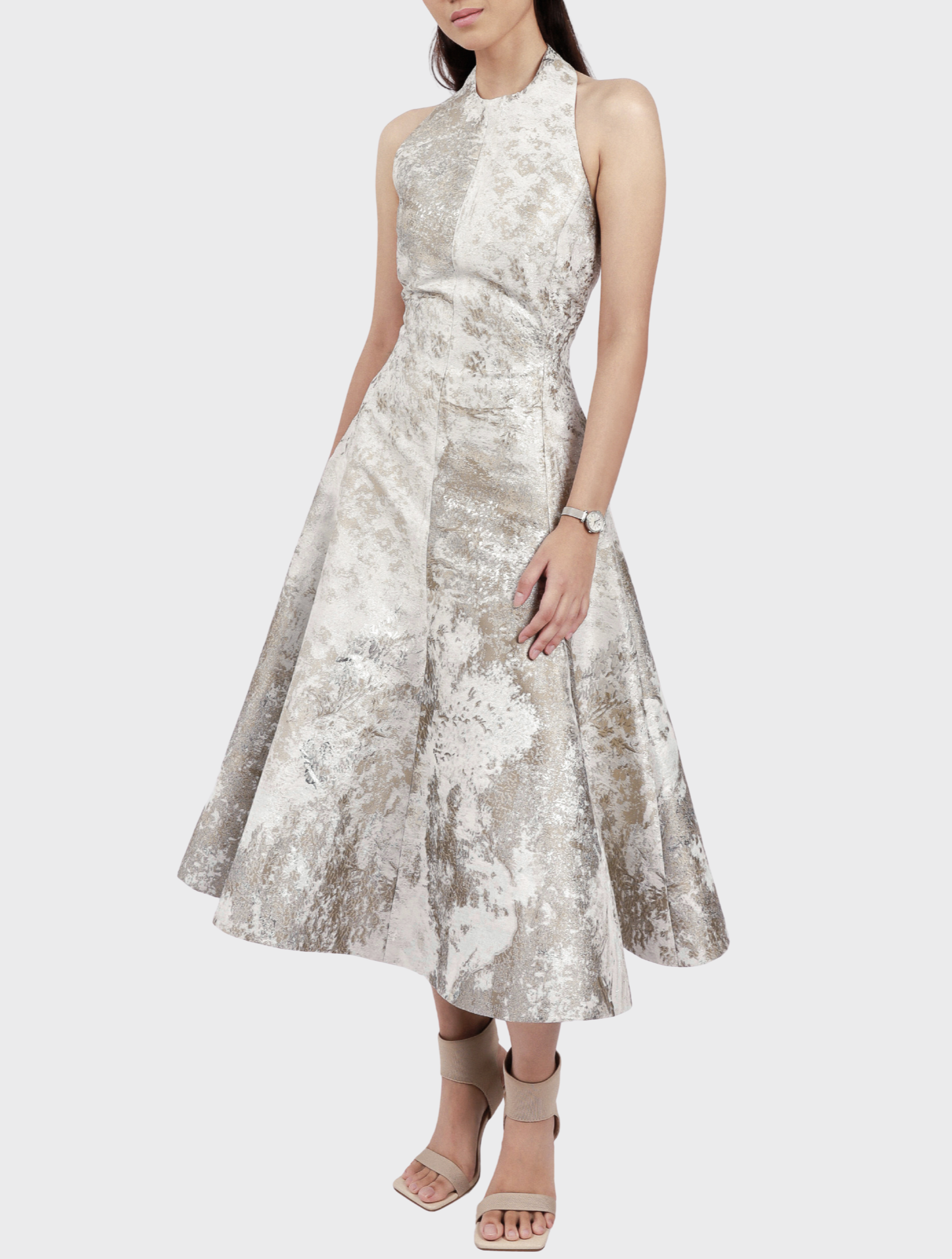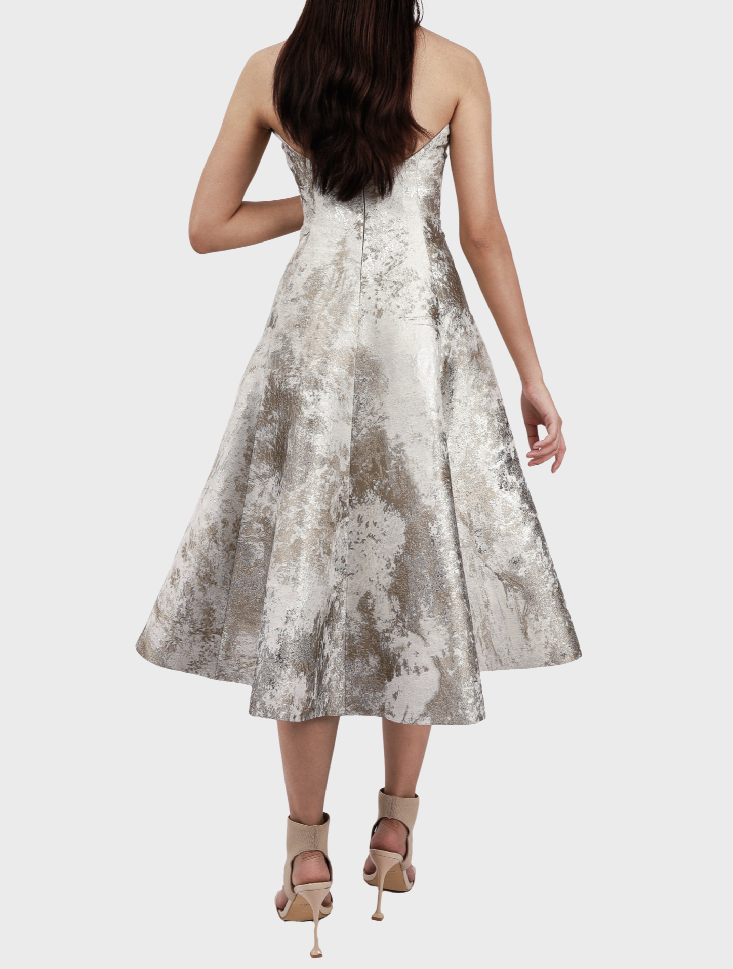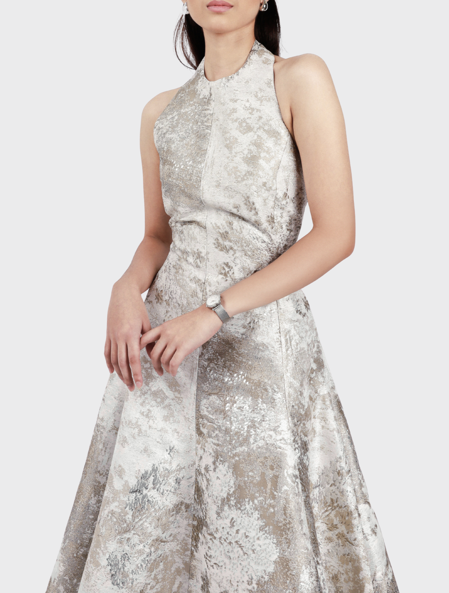 Anney in White Beige is a midi dress crafted from high-quality jacquard fabric. It features an asymmetrical neckline, a low back, and is fully lined with smooth satin for a refined finish. A hidden back zipper completes this elegant, non-stretchable piece.