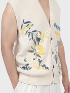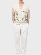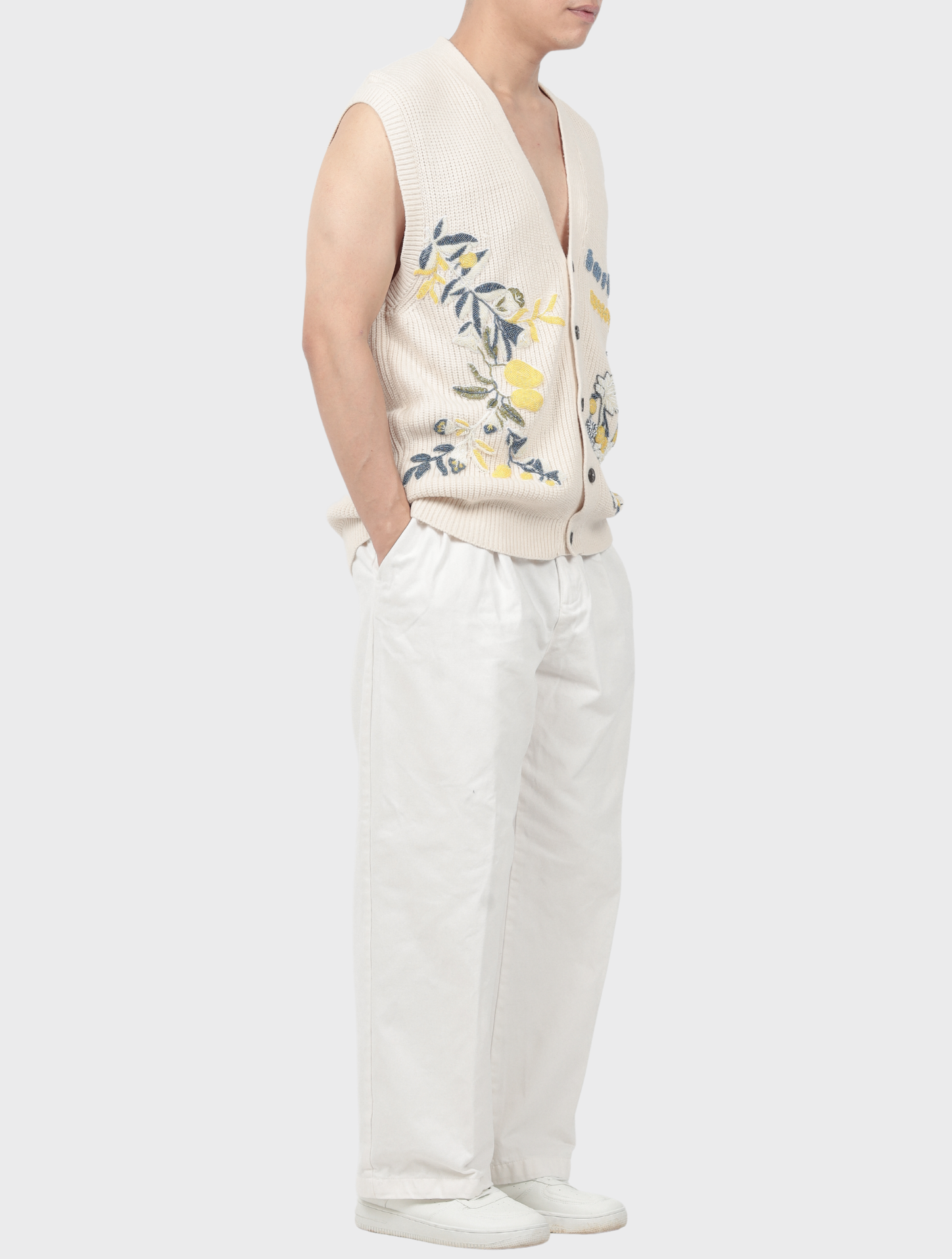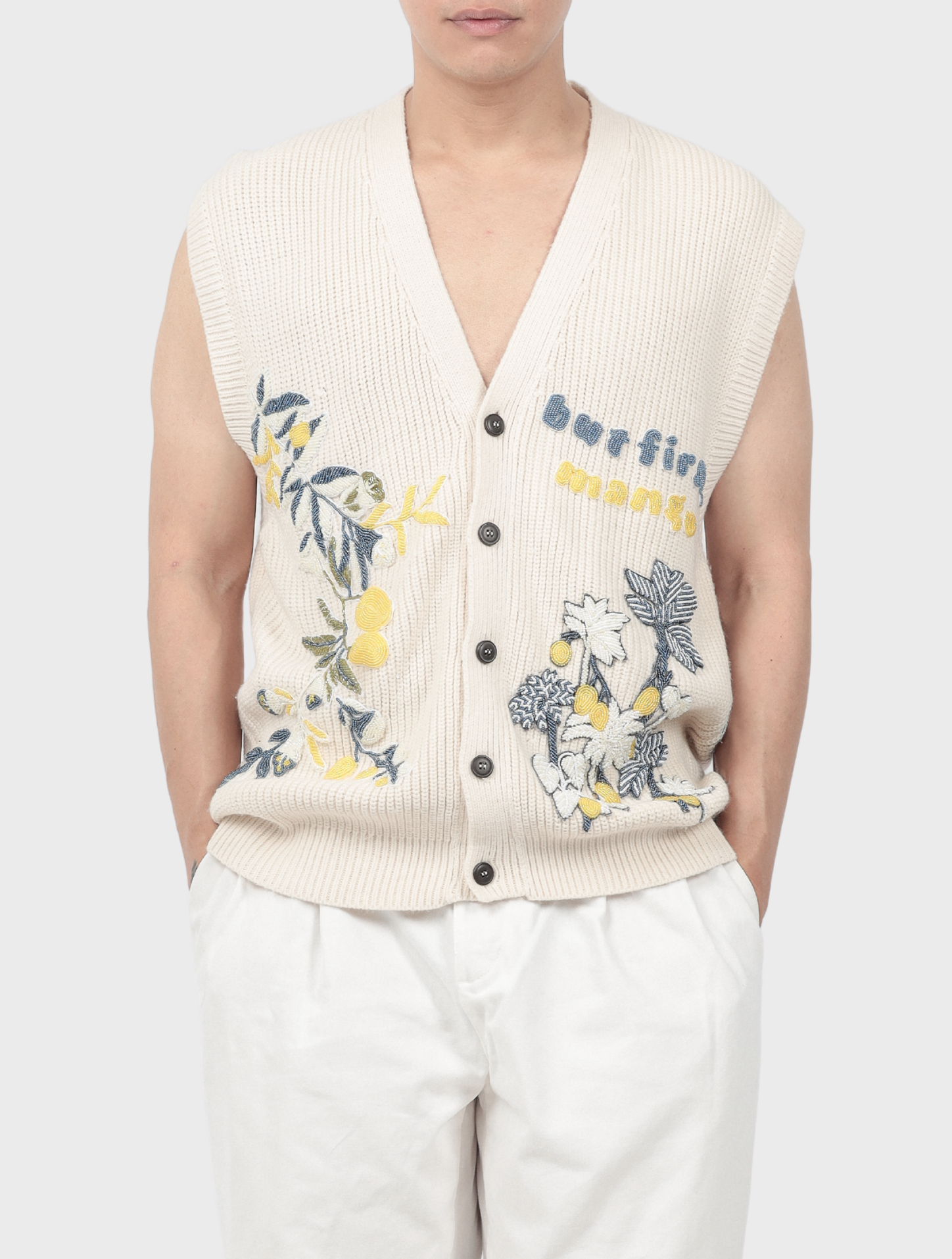 Embellished with stunning hand embroidery, exquisite tambour beads, and charming mango appliques to showcase the mouth-watering fruit in a luxurious way. This Sleeveless Sweater Vest Top features a Crochet Knit and a V-neckline, giving it a unique and trendy touch. The original 'FIZIWOO Harumanis' handmade tambour beads patterns add a playful and fun flair to this Sleeveless Relaxed Fit and Unlined Beige Cream cardigan.