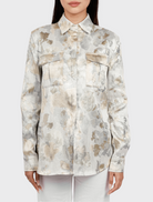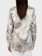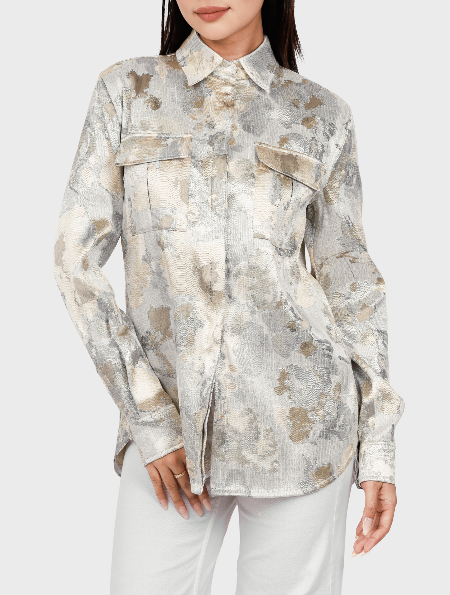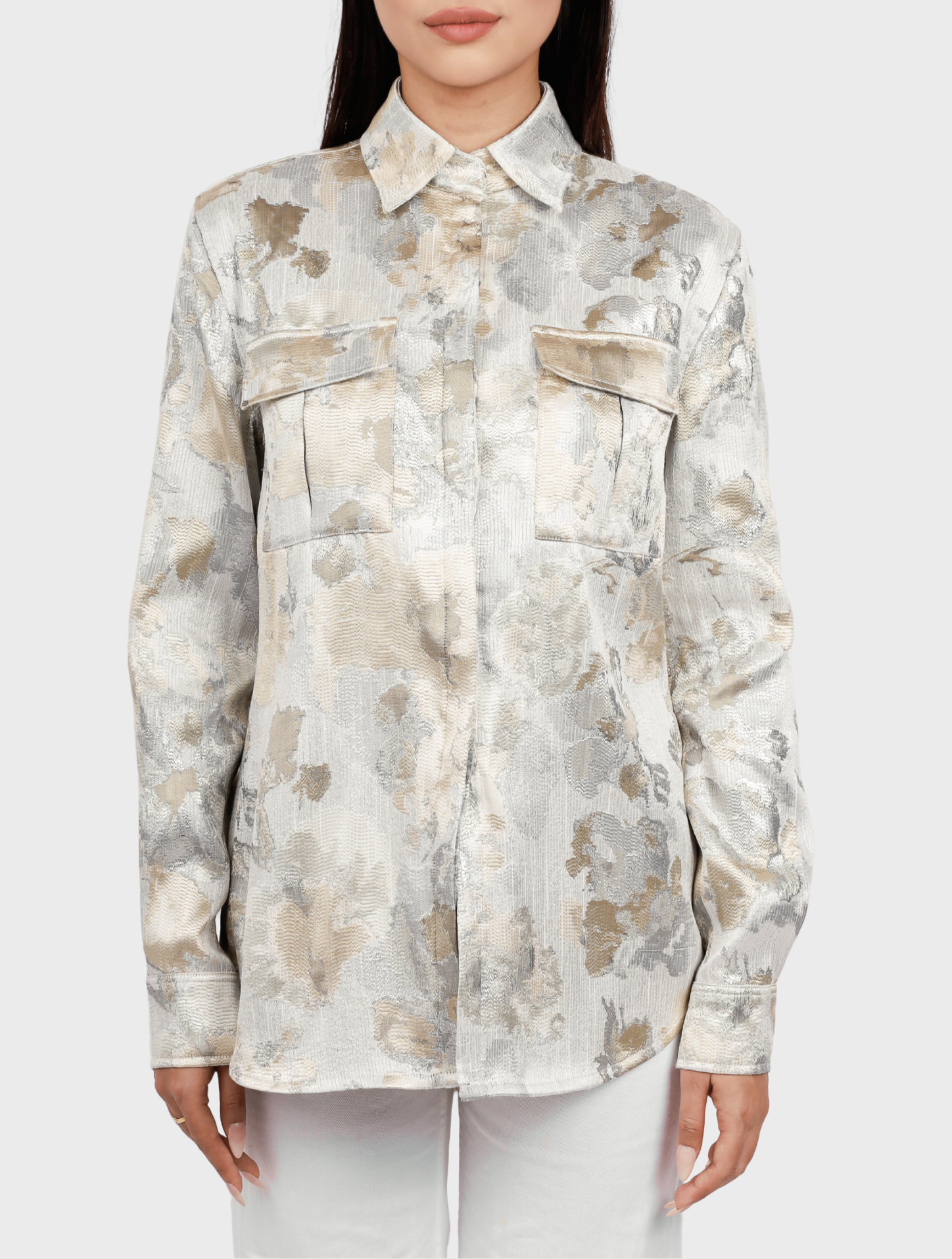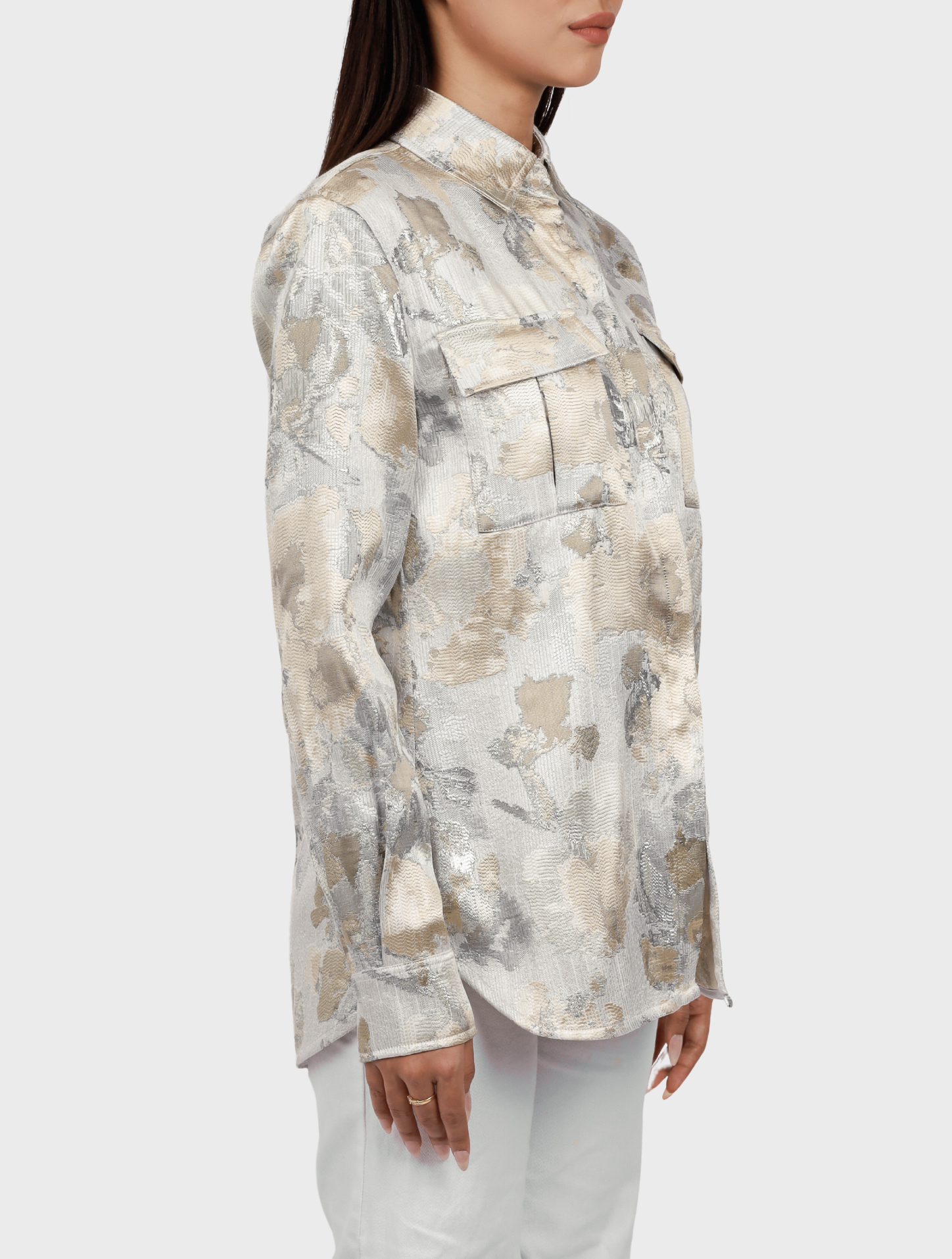 Basilique in White Beige is crafted from high-quality jacquard fabric with a refined textured finish. It features long sleeves, a collared neckline, hidden front buttons, flap pockets, and a front opening for a polished look. This non-stretchable piece combines elegance with practical sophistication.