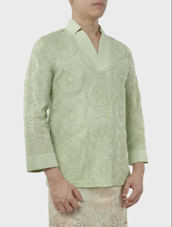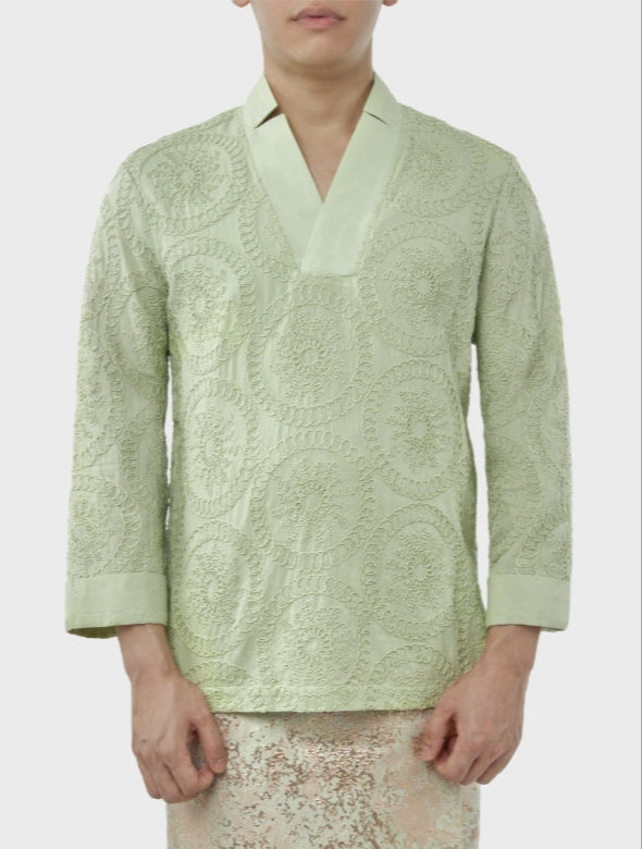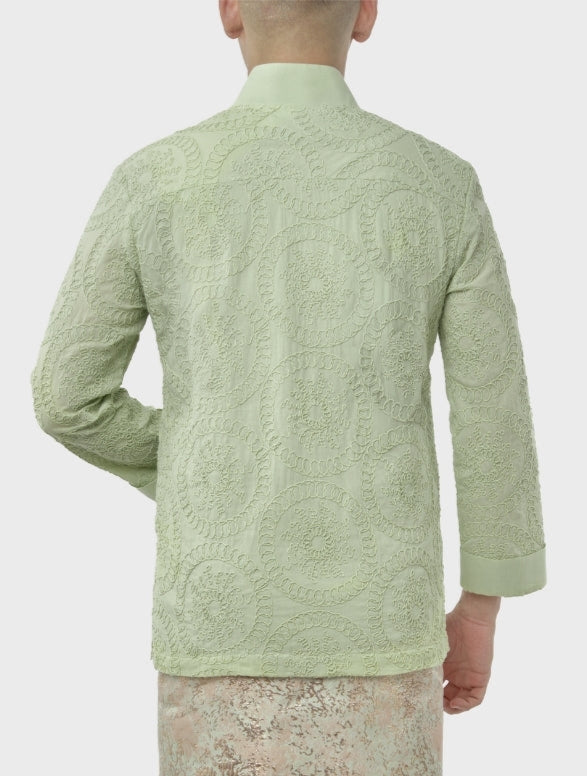 Ben in Tea Green is crafted from premium fabric and lined with smooth silk satin, offering comfort and a refined finish. Featuring a masculine V-neck collar, long folded-hem sleeves, hidden side pockets, and side slits, it blends timeless sophistication with modern versatility.