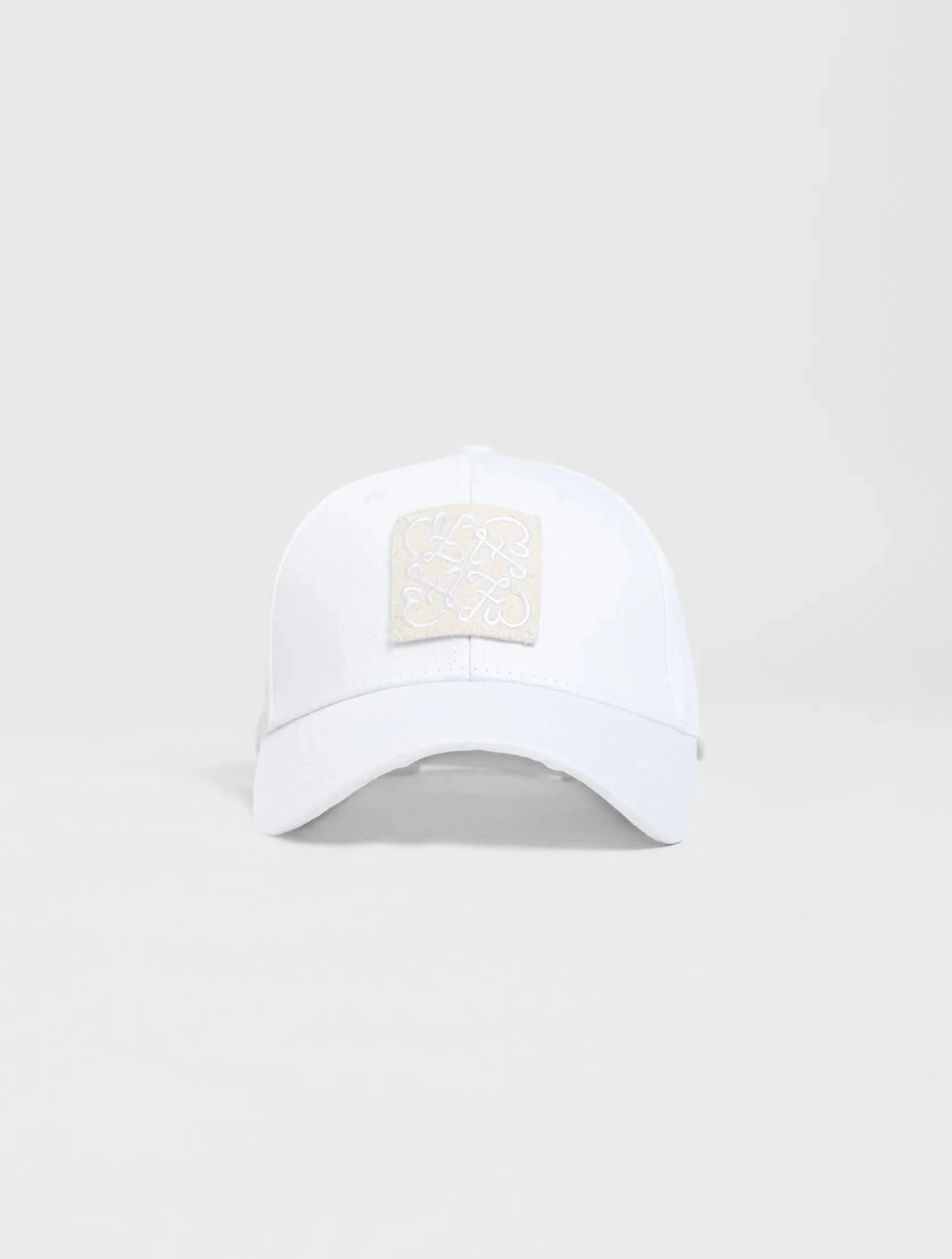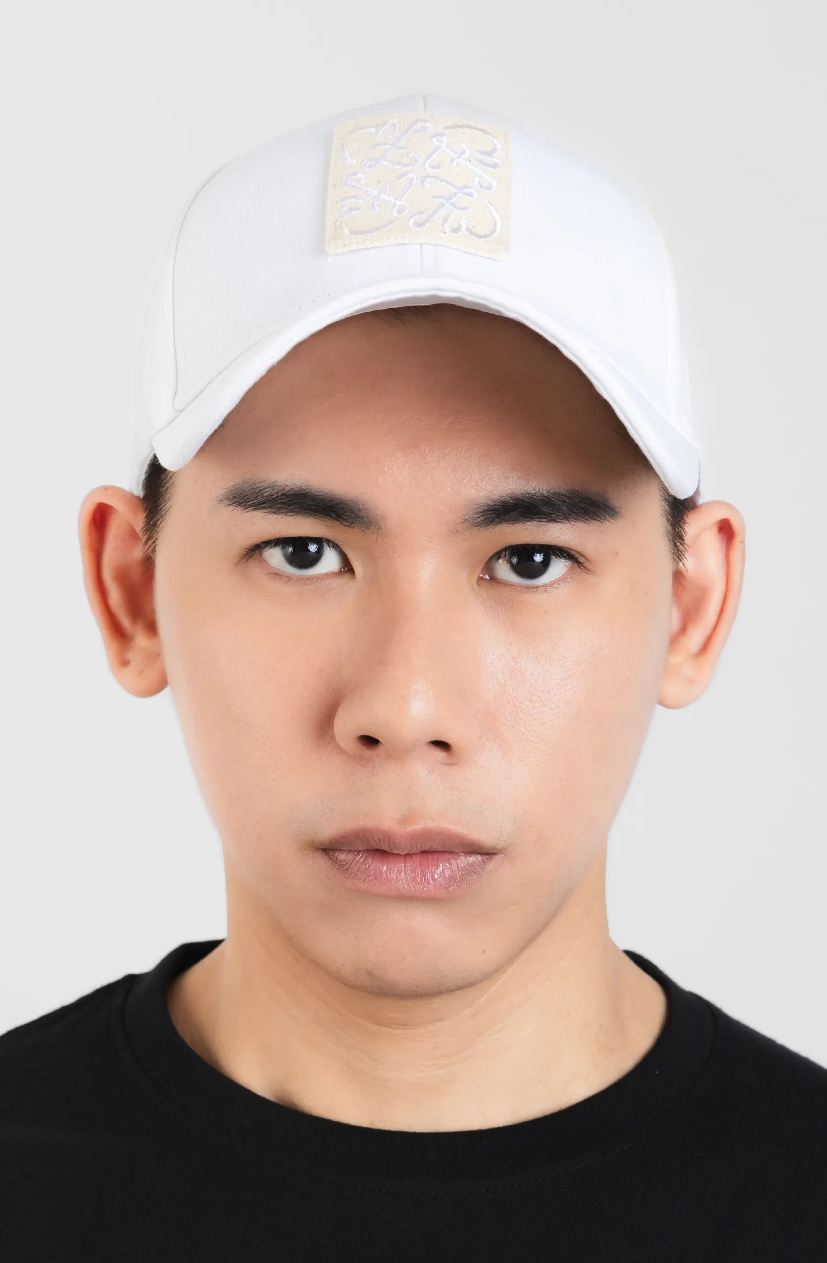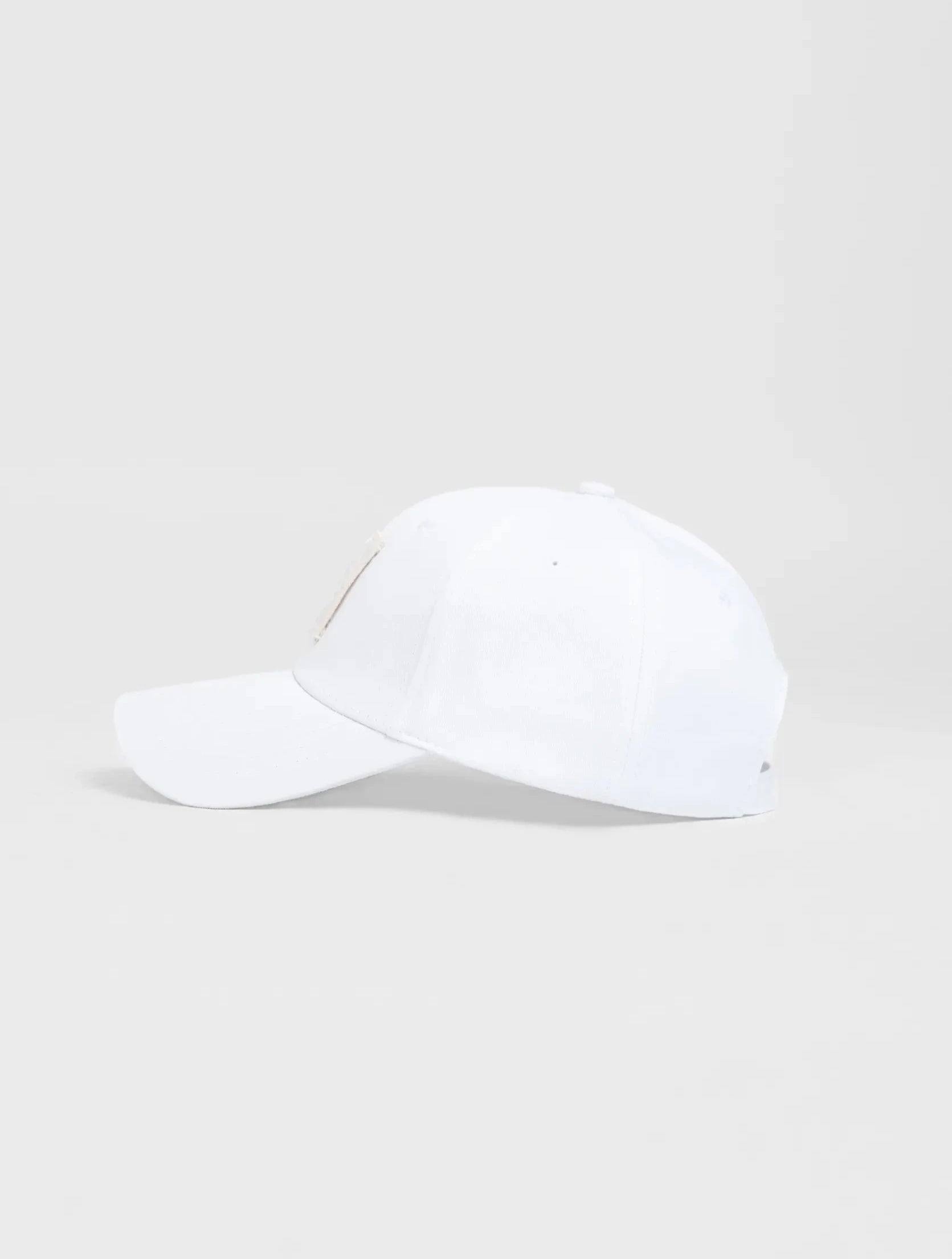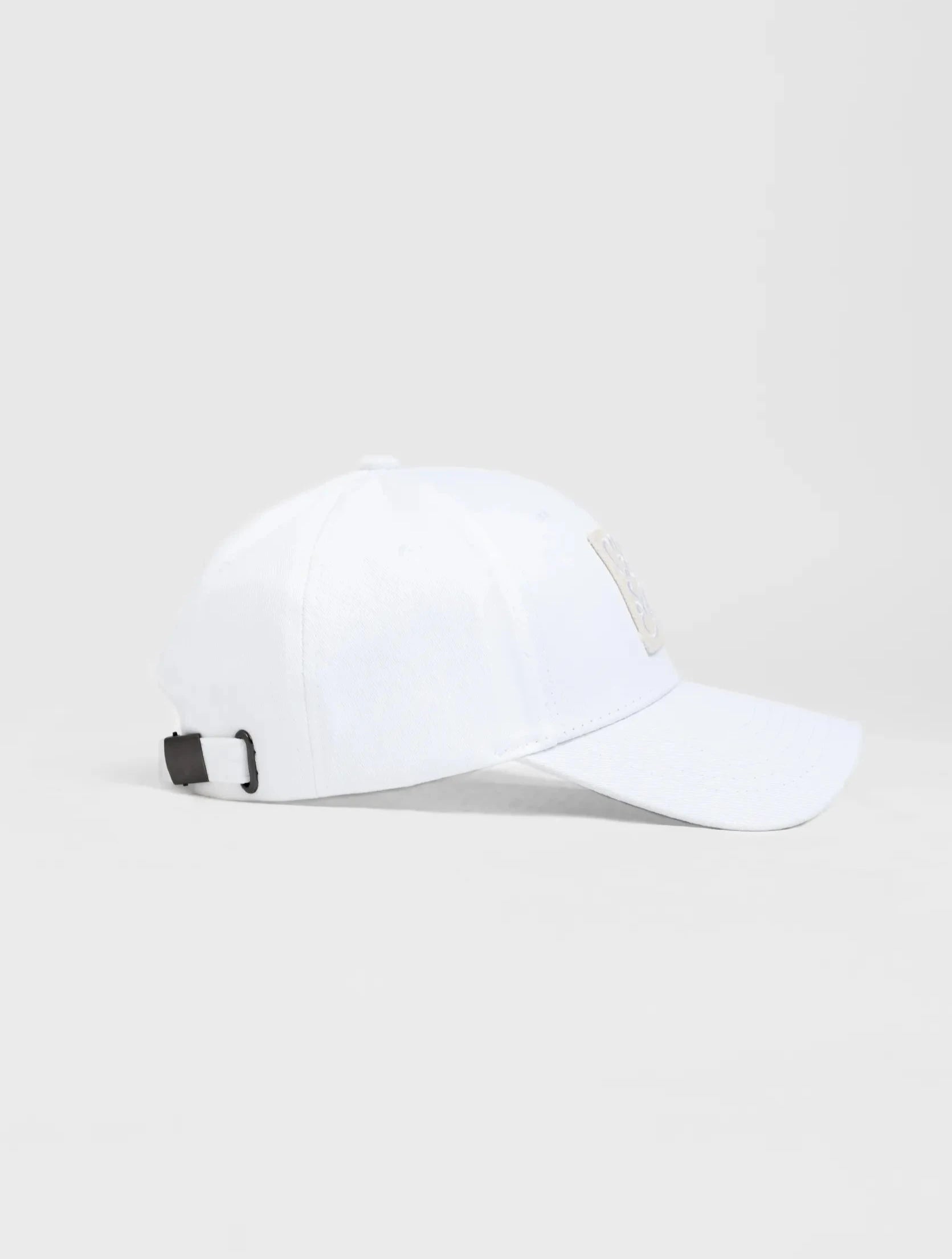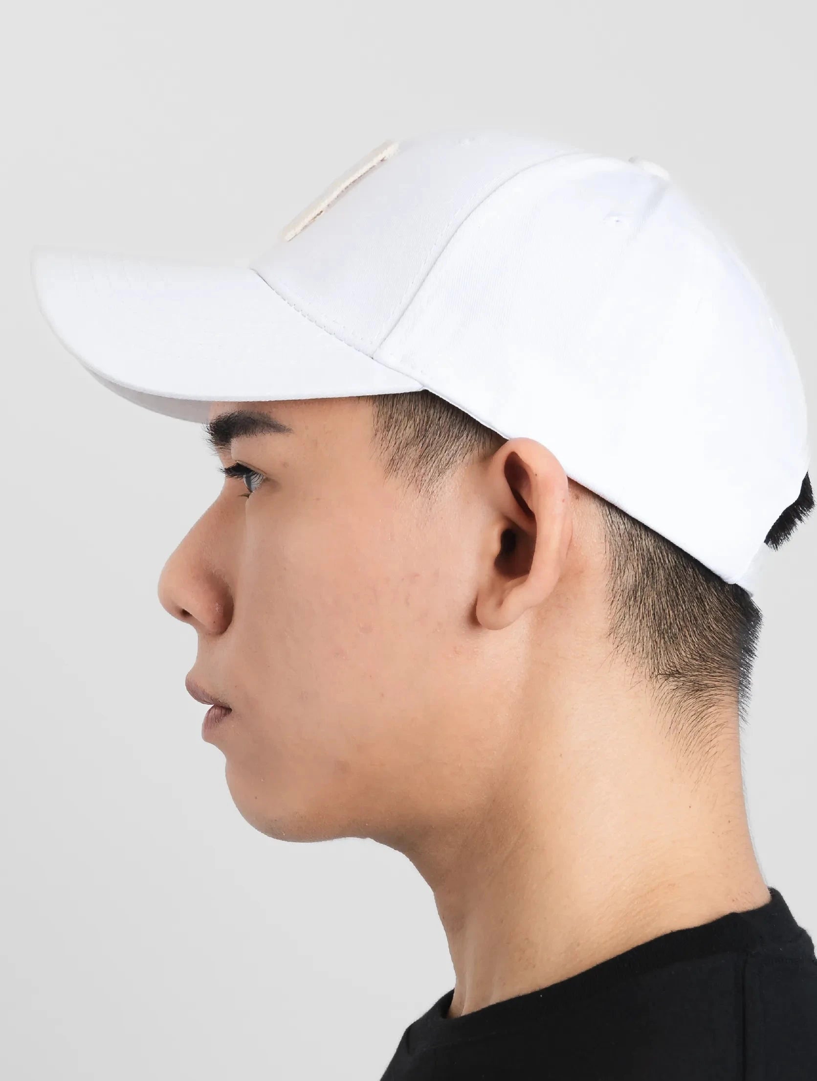 Logo Cap in White is made from premium canvas cotton for lasting comfort and style. It features an embroidered patch logo and neat hand-stitched details. A top-stitched visor adds structure, while the metal buckle at the back allows for an adjustable fit.
