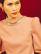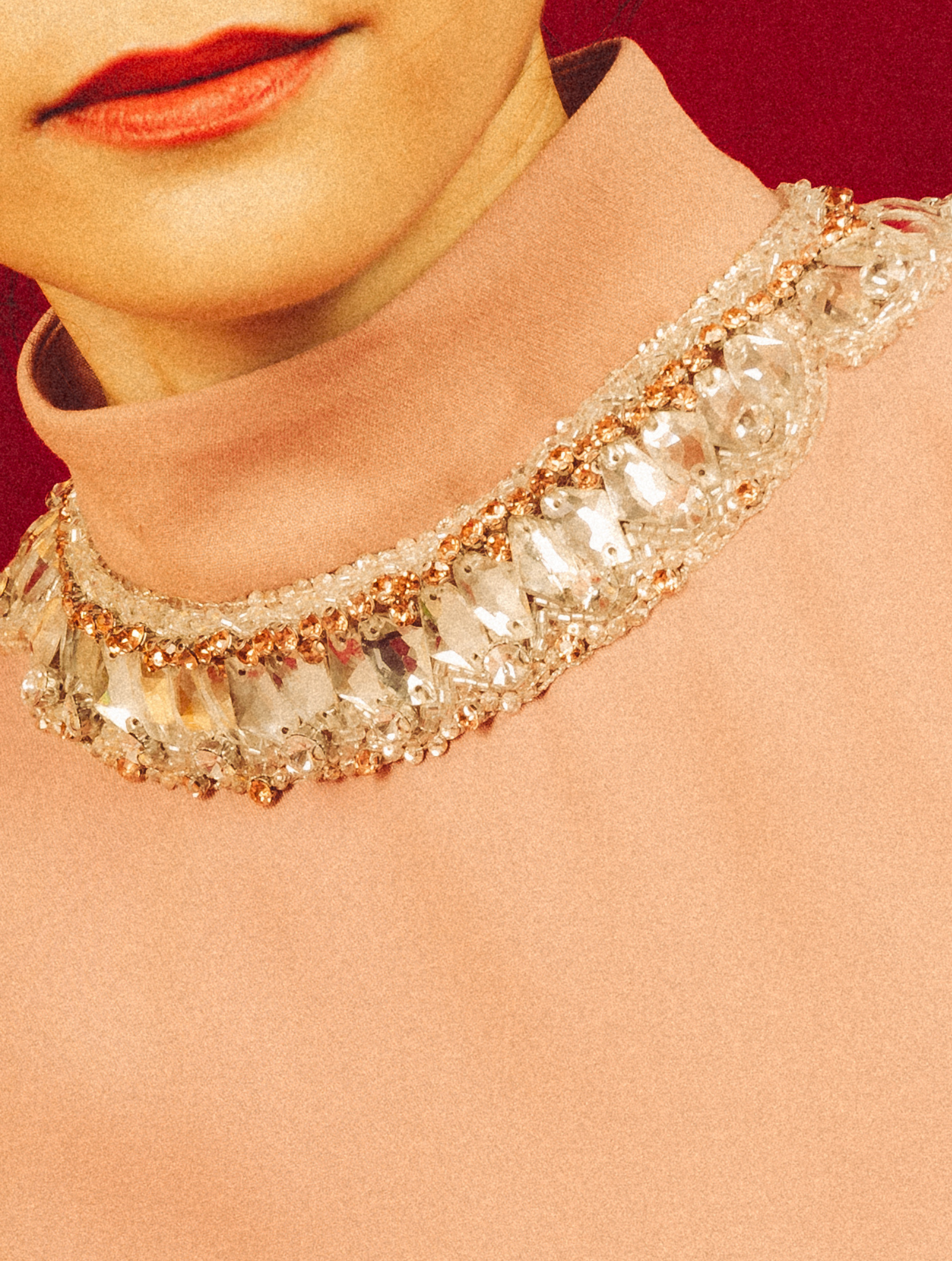 Chao-Xing in Dusty Pink is a hip-length mini dress features a refined Mandarin collar with delicate bead embellishments. Crafted from high-quality fabric, it includes statement puff sleeves with extended cuffs and is fully lined for comfort. A hidden back zip with hook fastening completes this non-stretchable, elegant silhouette.