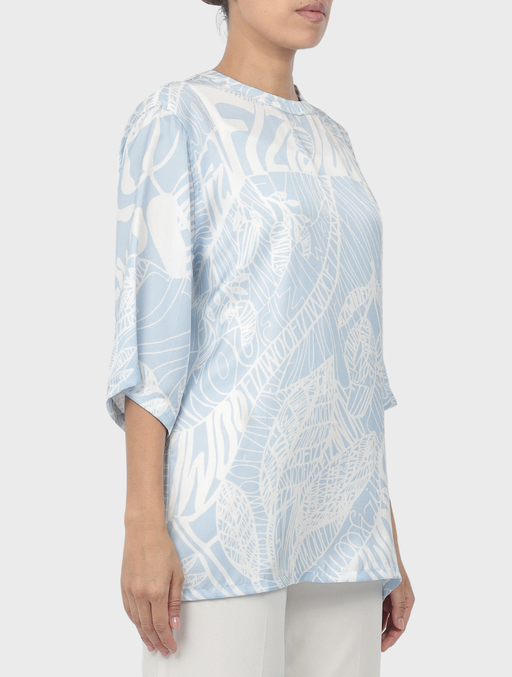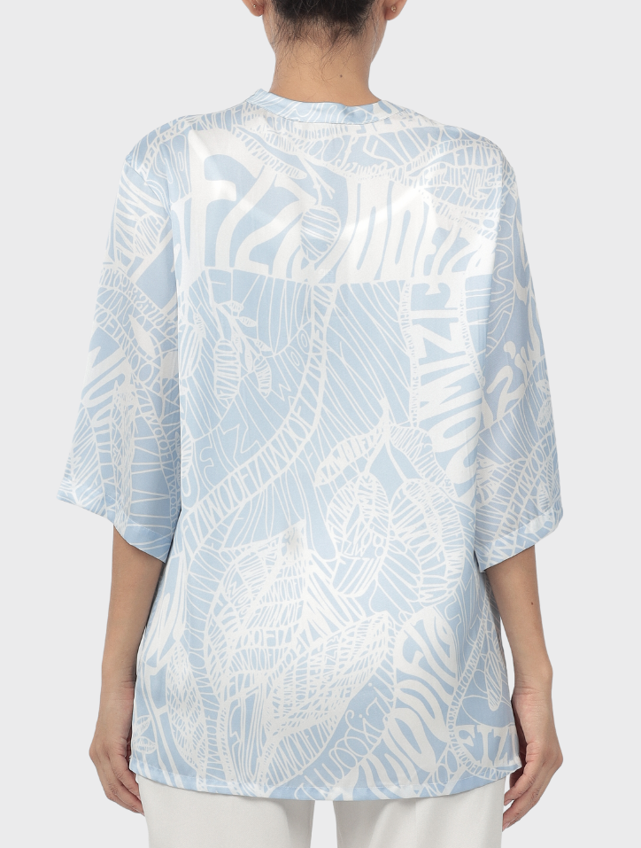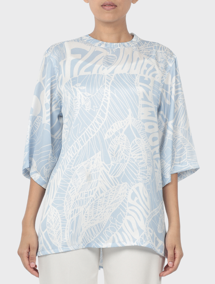 The distinguished Harumanis collection presents refined aesthetics through eloquent phrasing, vibrant chromatic selections, and playful artistic elements. Drawing subtle inspiration from 90's Hip Hop sensibilities, this meticulously crafted round-neckline T-shirt harmonizes sophistication with functionality through its discreet shoulder zipper detail. The thoughtfully conceived relaxed silhouette with 3/4 sleeves adapts gracefully across diverse settings, offering versatile elegance for any occasion. Fashioned from premium cotton poly-blend silky twill fabric, this garment showcases Fiziwoo's signature graffiti artistry, introducing a bold yet refined artistic expression that elevates this sophisticated wardrobe essential.