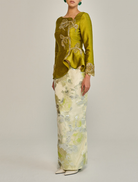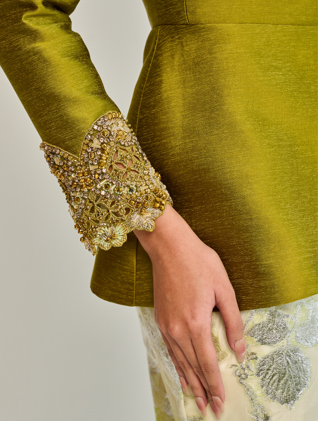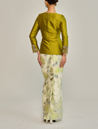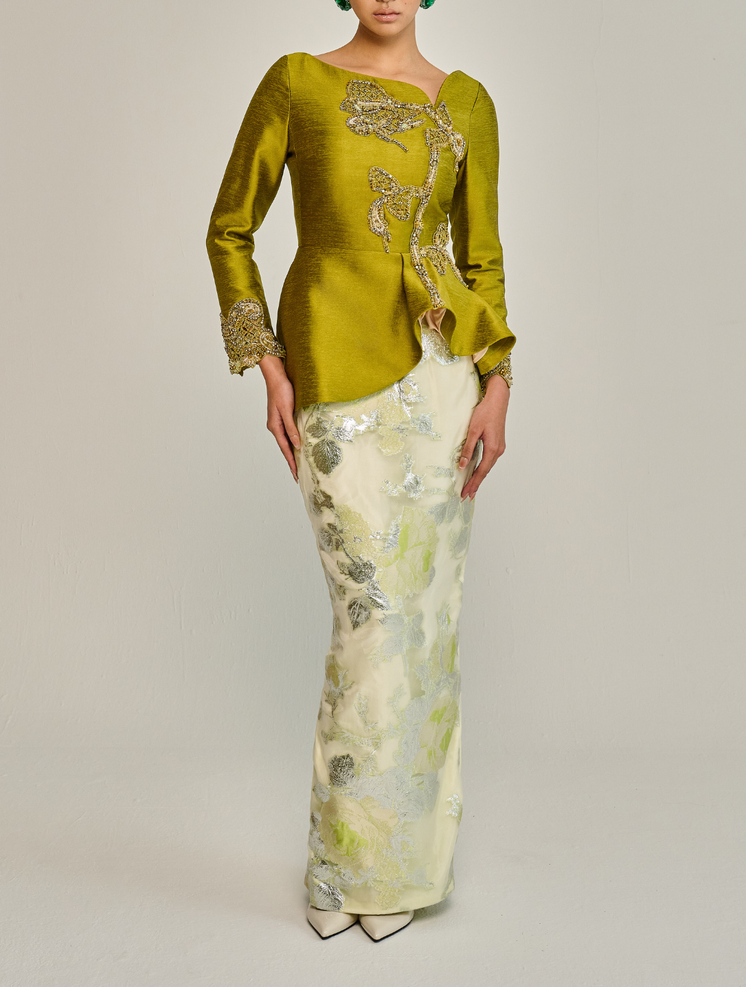 Citra features an asymmetrical boat-neckline top with slim sleeves and refined beading along the front panel. Fully lined for comfort, it is paired with a pencil skirt with a back-overlapped slit, balancing clean structure with controlled movement.