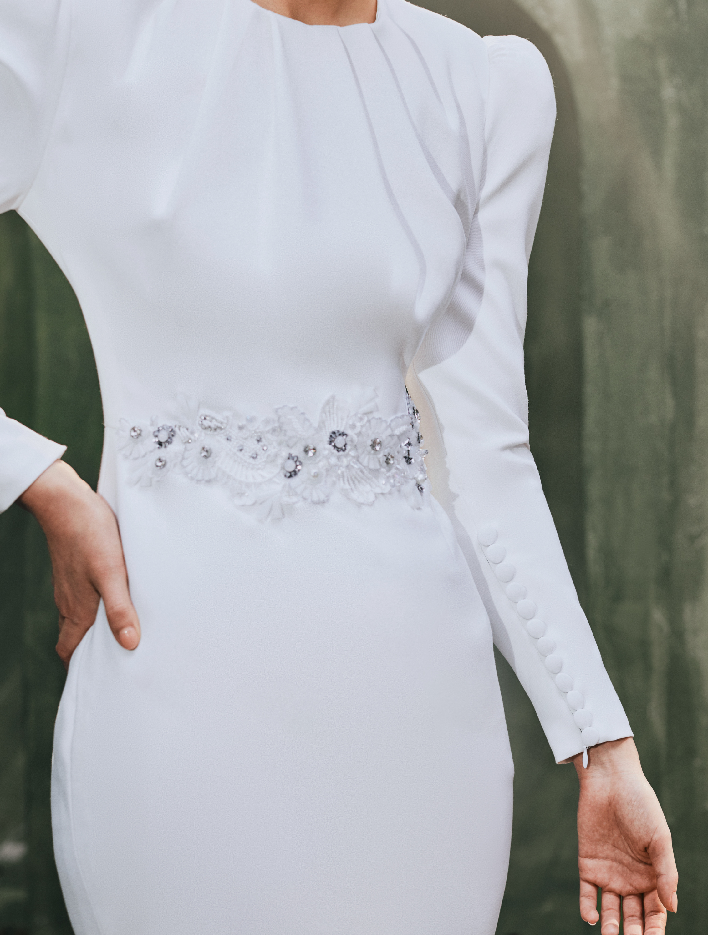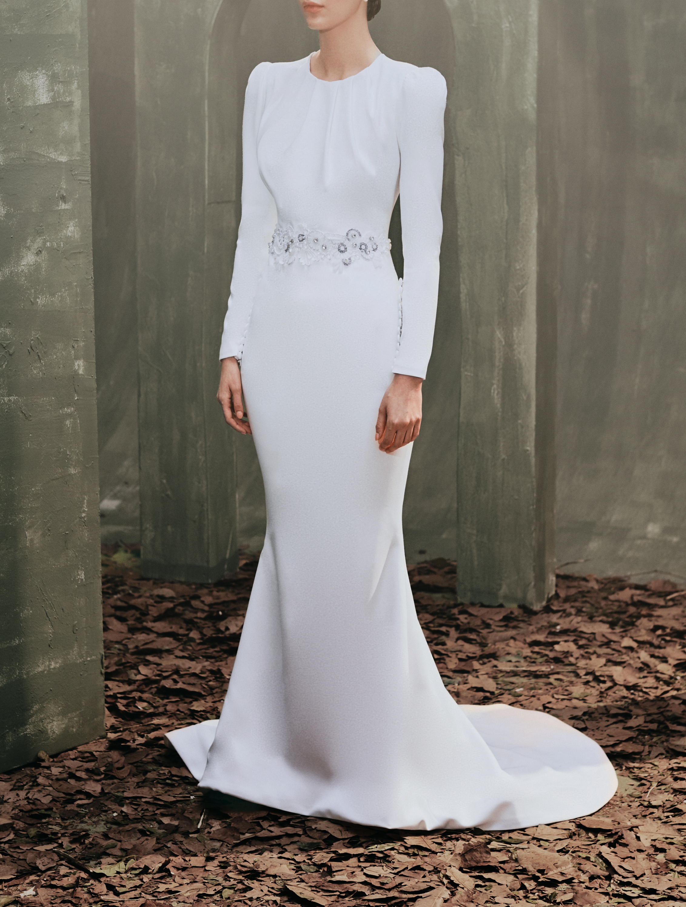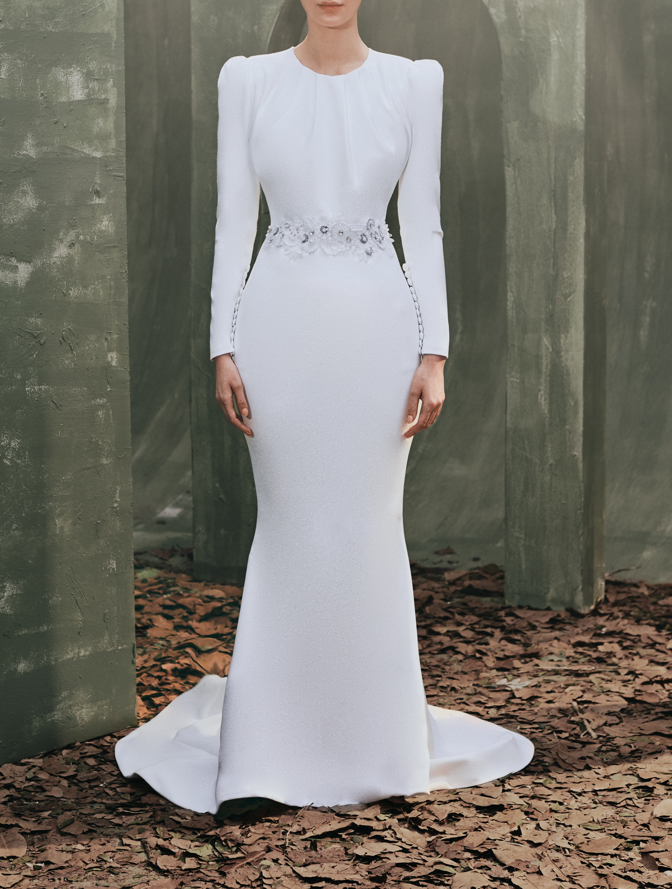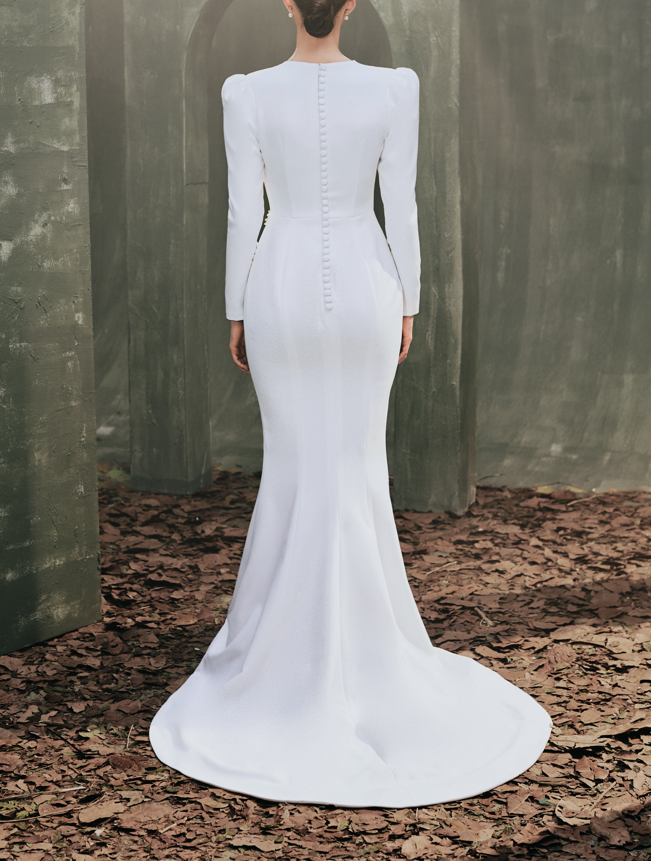 The Elizabeth Long Dress is designed with a pleated round neckline and long puff sleeves accented with hidden zippers. A concealed backzip with hook closure ensures a seamless fit, while full lining provides comfort and structure. Finished with a beaded long tail anddecorative mushroom buttons, this piece embodies timeless elegance in ivory white.