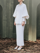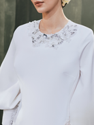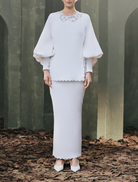 The Camilla Kurung Kedah in Off White exudes timeless sophistication with a refined round neckline adorned with delicate beadwork. Its statement balloon sleeves and extended cuffs create a graceful, modern silhouette. Finished with intricate embroidery and decorative buttons, this fully lined piece beautifully blends tradition with contemporary elegance.