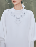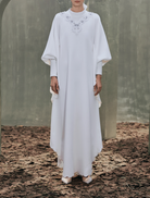 The Noor Modern Abaya features graceful balloon sleeves with extended cuffs and a mock neckline embellished with delicate beads. Subtle embroidery adds refinement, complemented by a sash tie at the back and decorative mushroom buttons. Crafted from a cotton-poly blend and fully lined in ivory white, it blends comfort with understated sophistication.