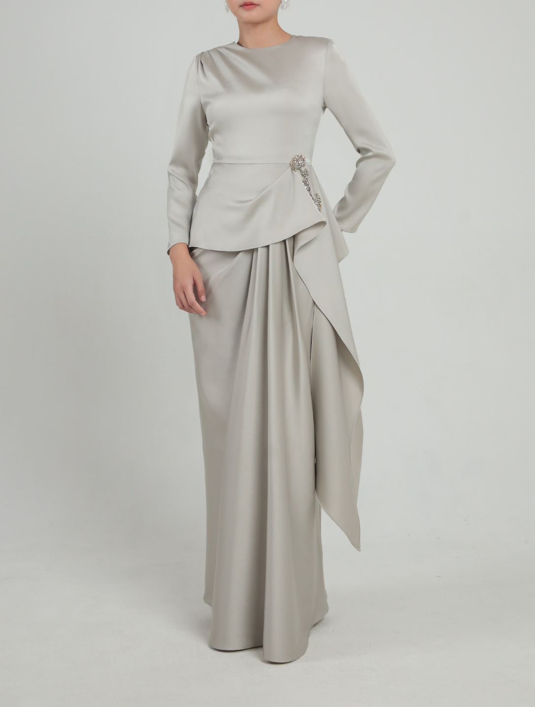 Daiyan, a contemporary short kebaya with a soft peplum silhouette. Designed with a round collar, gentle side draping and relaxed long sleeves with light shoulder padding. Finished with floral beadwork at the waist and paired with a fixed pario skirt with elastic waistband. Unlined for a light, effortless feel.