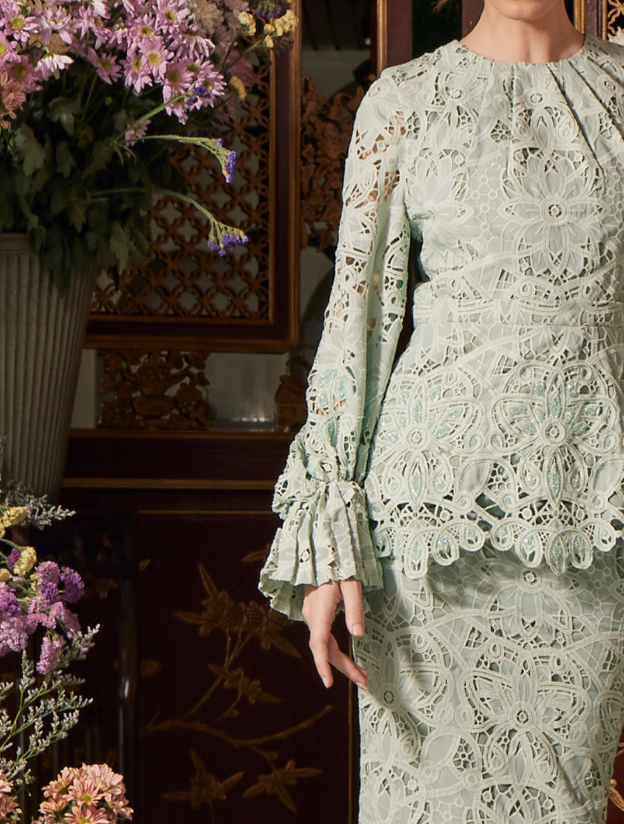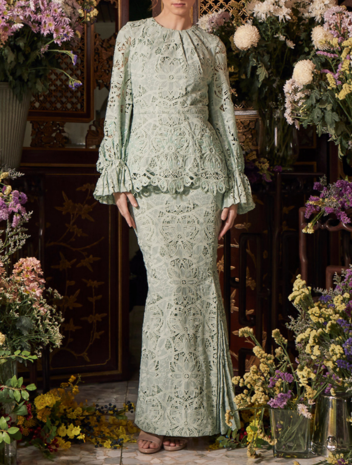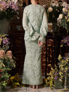 This elegant mini kurung redefines modern sophistication with its pleated draping round neckline and statement lantern sleeves with pleated puff detailing. Designed for both style and comfort, it features a sarong-folded skirt that drapes beautifully, creating a graceful silhouette. The back zipper ensures a seamless fit, while the semi-elastic waistband offers added flexibility for all-day wear. A perfect blend of tradition and contemporary elegance, this piece is a must-have for any refined wardrobe.