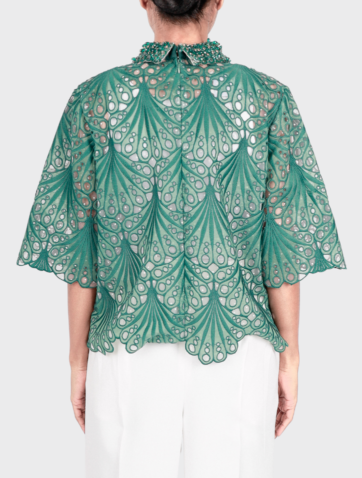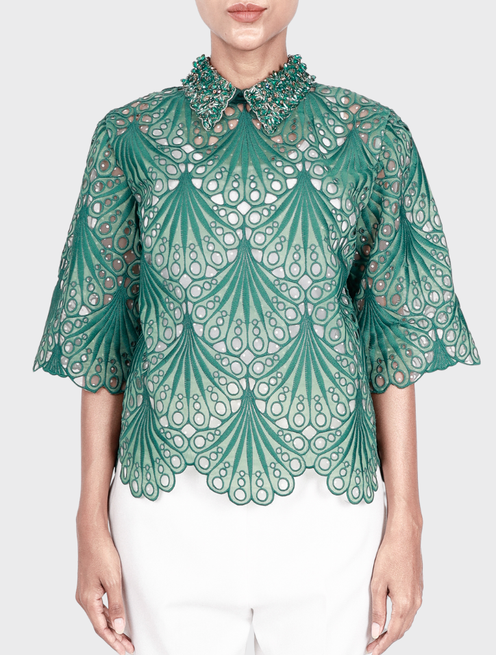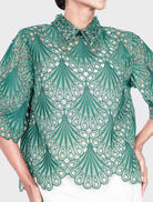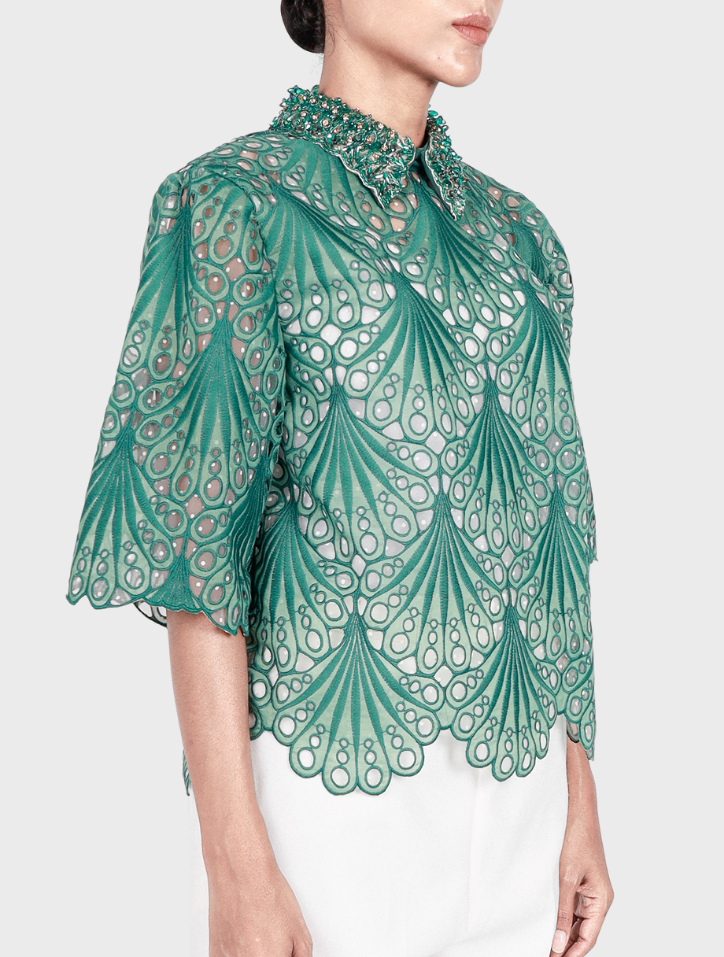 Saleccia blouse in Forest Green is crafted from exquisite guipure lace with cotton guipure embellishments. It features a collared neckline, hidden back zip with hook fastening, and puff mesh glitter net sleeves with cuffs. Lined with mesh glitter net, this non-stretch piece combines premium fabrics with elegant detailing for a refined finish.