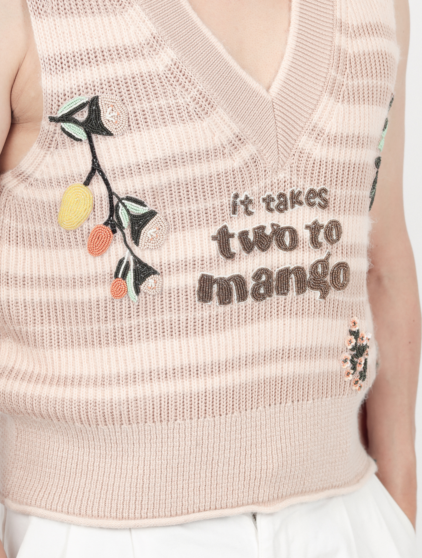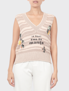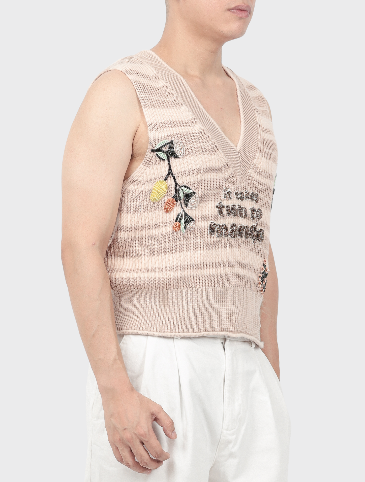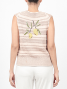 This sleeveless vest is made from opulent cotton crochet knit and has a soft yet structured texture that guarantees comfort and style. Breathability is improved by the open-knit construction, and the regular fit and clean V-neckline are highlighted by the natural drape. Finished in a beautiful peach pink, it serves as a sophisticated backdrop for the handcrafted tambour beading that is characterized by FIZIWOO's distinctive creativity and is inspired by the Harumanis, the renowned "Musang King of Mangoes."