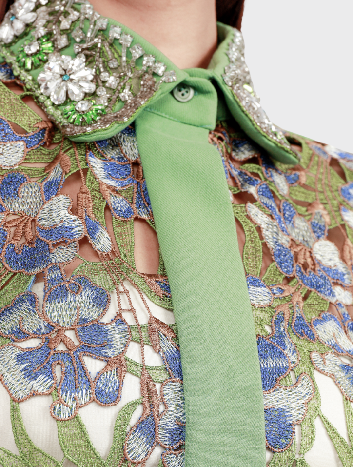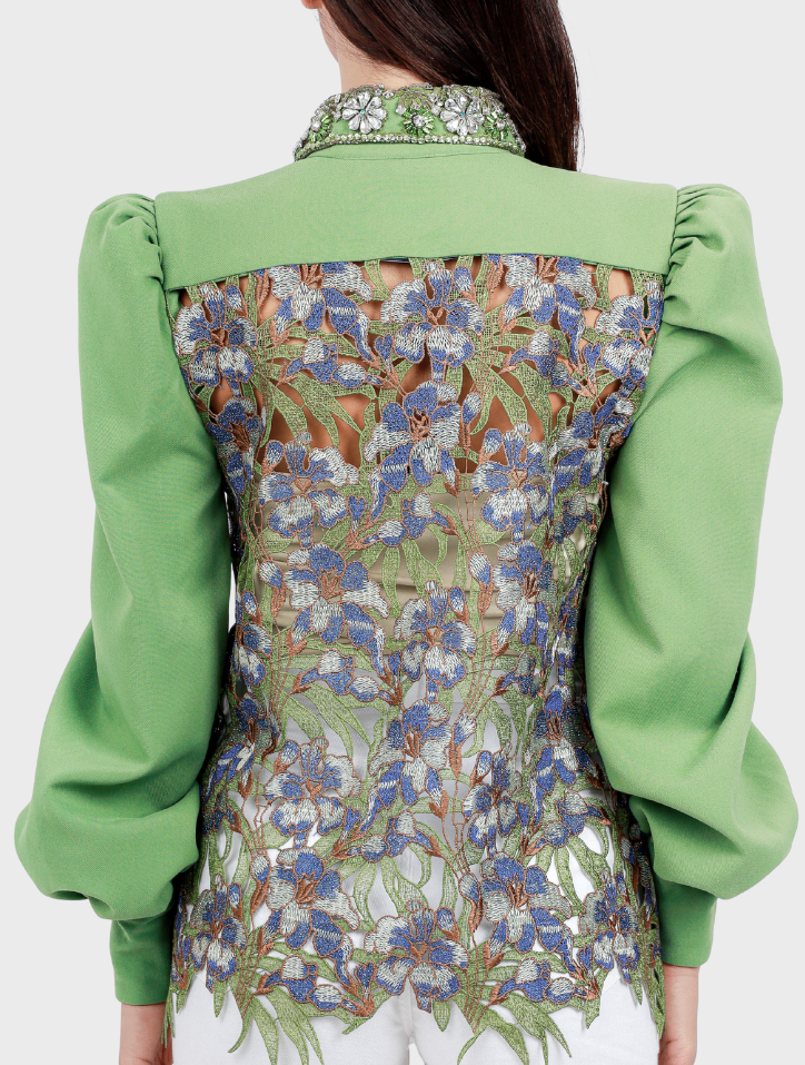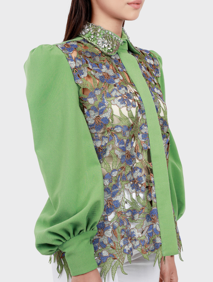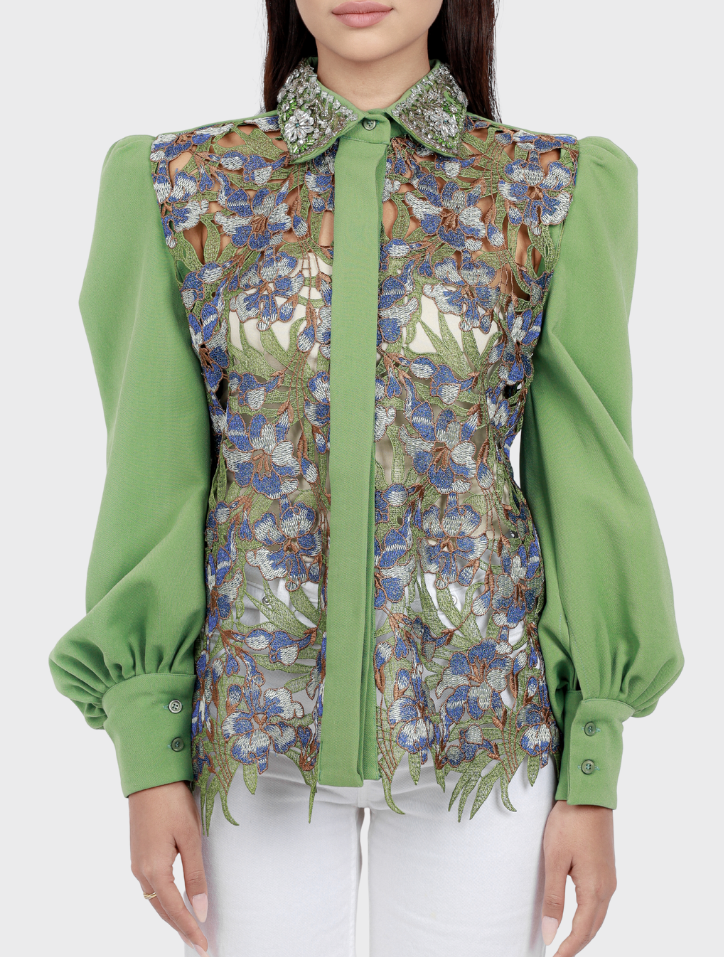 Indulge in the luxuriousness of our exclusive Elizabeth In Basil Green blouse. Made from high-quality cotton guipure, this stunning piece features intricate embellishments and a chic, collared neckline. The puff sleeves with cuffs add a touch of elegance, while the comfort fit cutting ensures a flattering silhouette. Perfect for any occasion, this unlined blouse has an alluring opening at the front, making it a standout addition to your wardrobe.