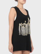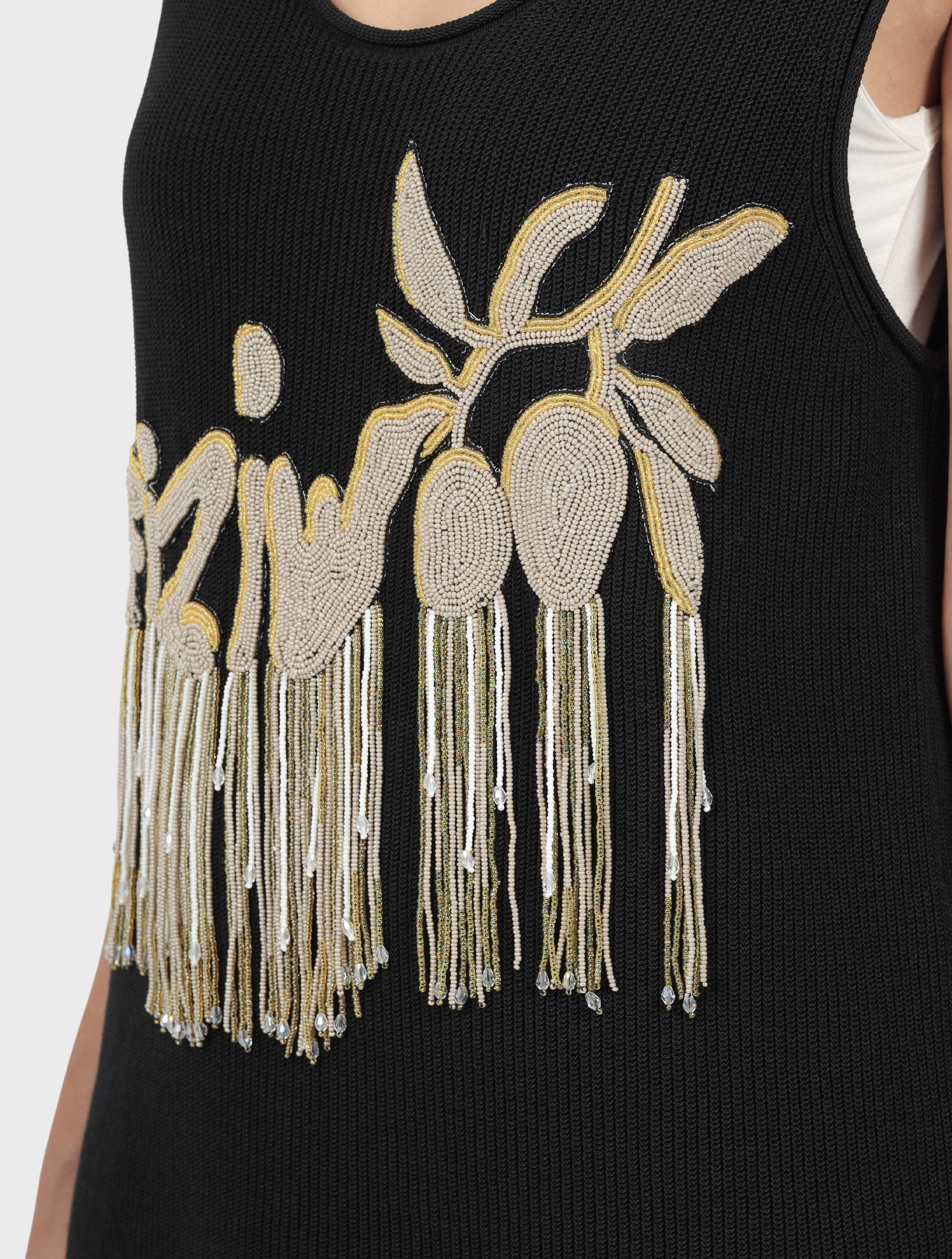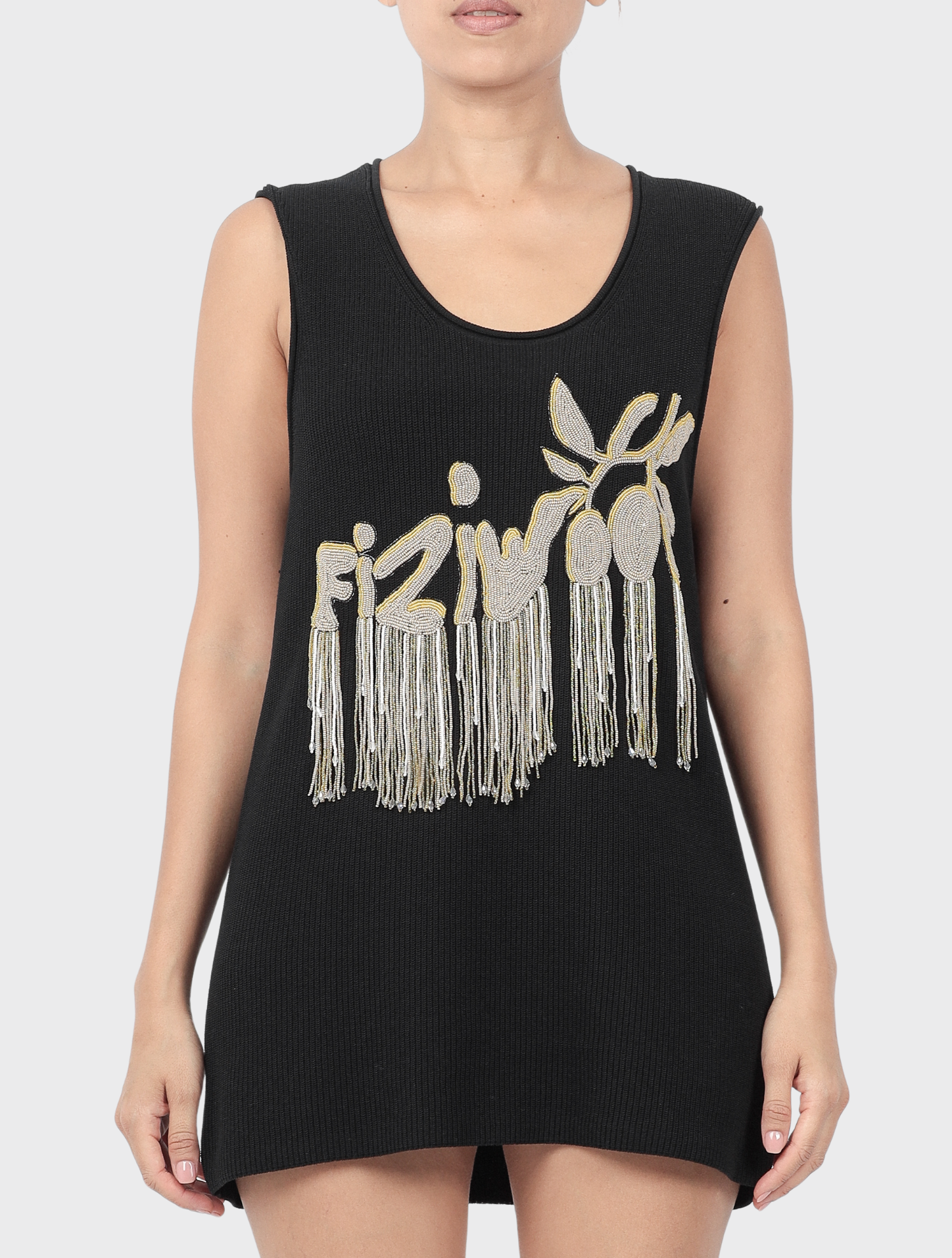 This sleeveless tank top is made from high-quality cotton crochet knit and has a naturally soft drape and a lightweight, breathable feel. With its round neckline and regular fit, the open-knit construction keeps a sophisticated silhouette while improving comfort. It is exquisitely embellished with the distinctive "FIZIWOO Harumanis" handcrafted tambour beading and presented in Jet Black for a hint of subtle richness.