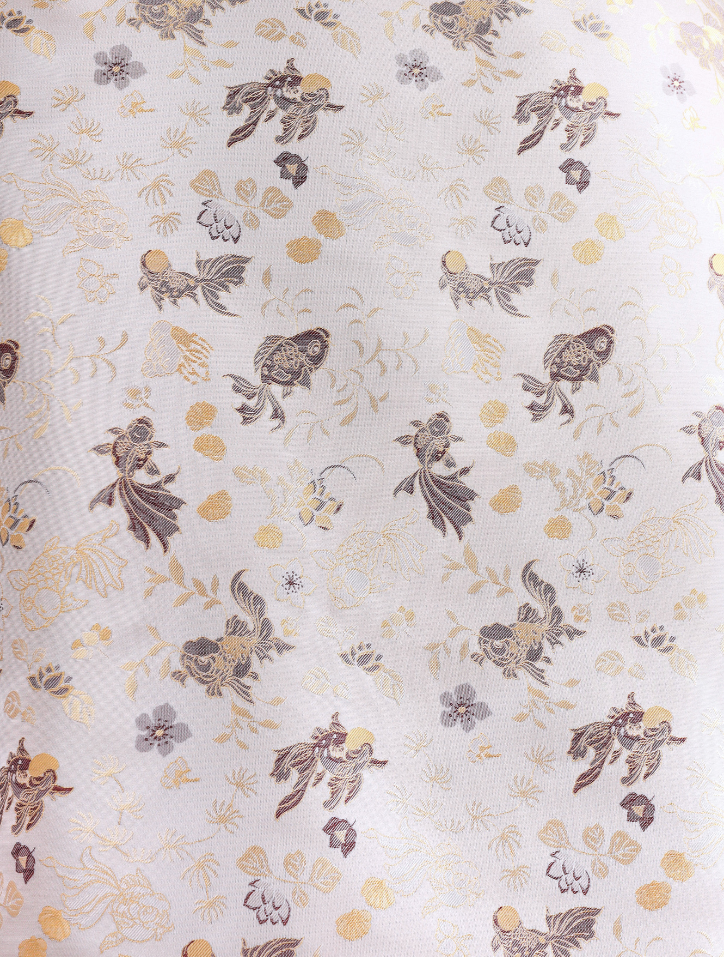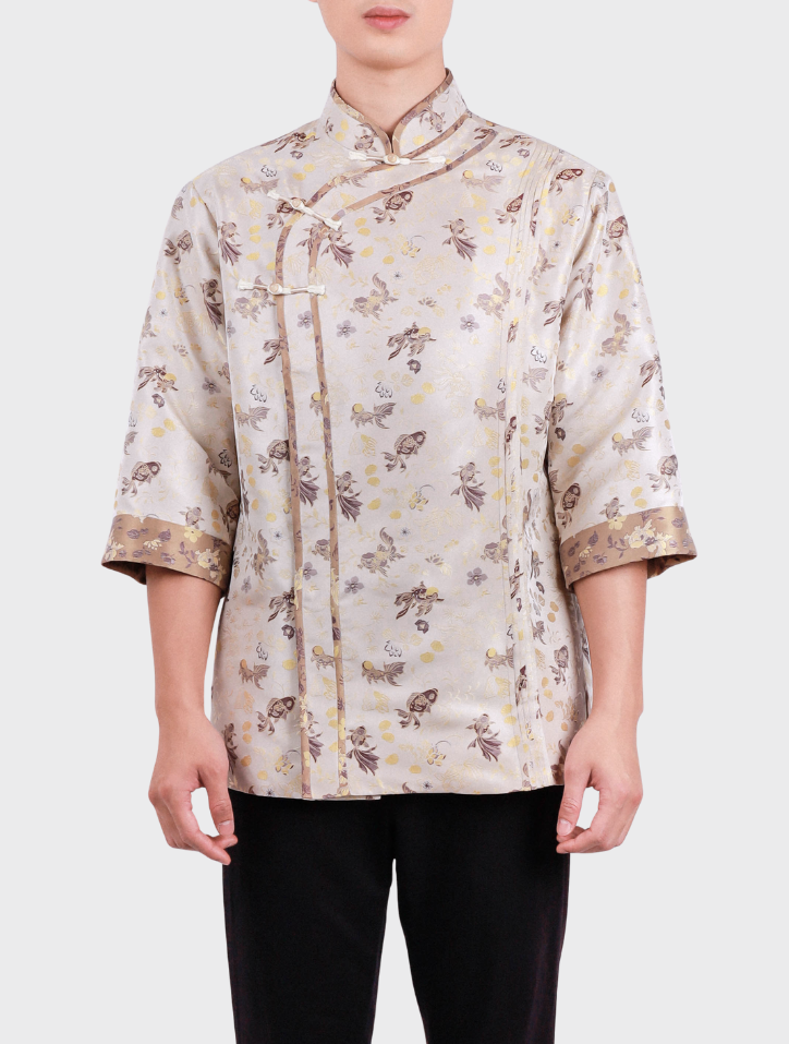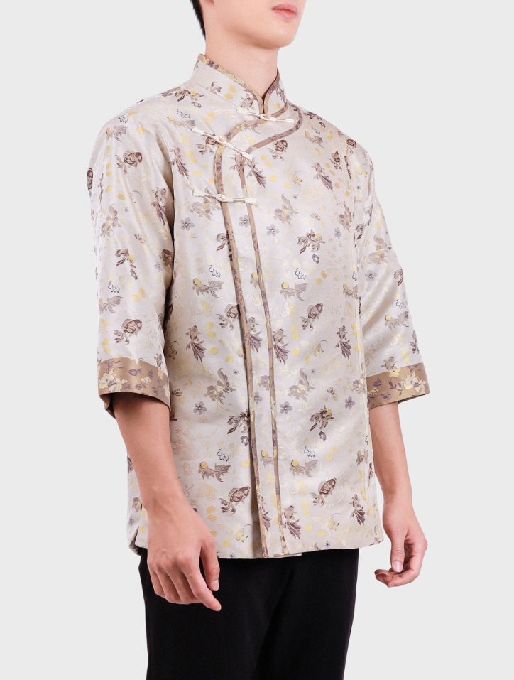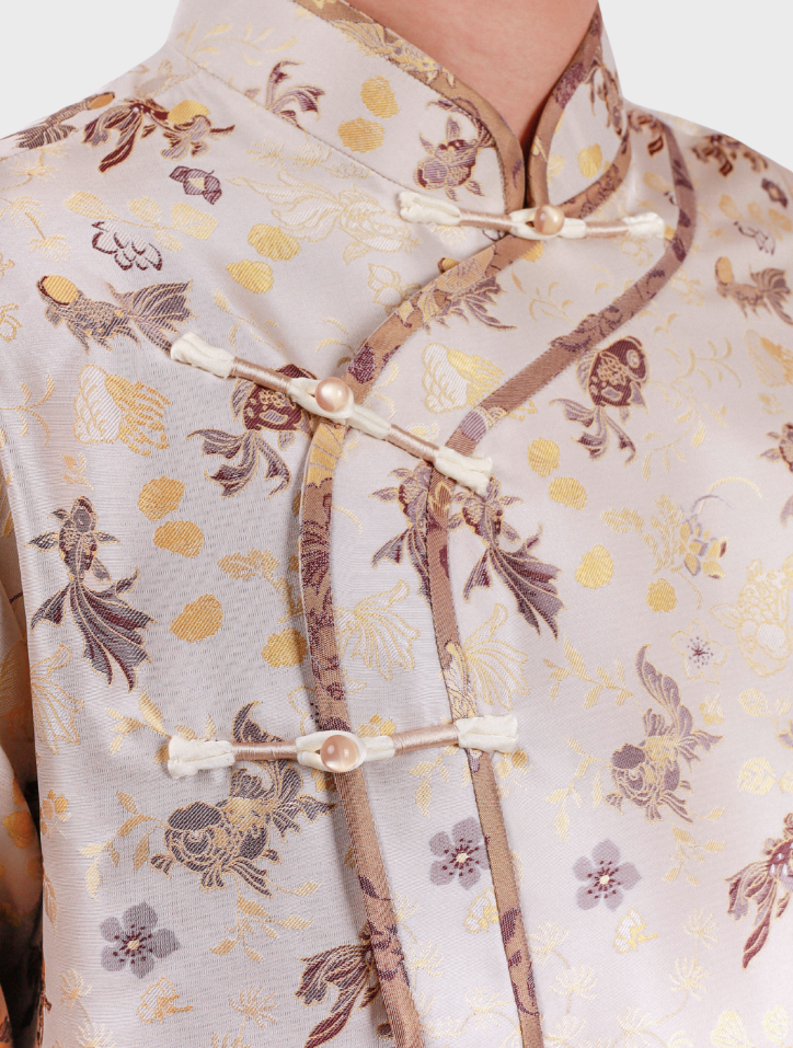 Er Tai in Ivory Yellow is crafted from refined jacquard fabric in a soft ivory yellow tone. It features a Mandarin collar with piping, a front closure with traditional Chinese frog fasteners, and delicate pintuck detailing. The 3/4 sleeves are finished with folded panels, while the interior is fully lined with satin silk and structured with shoulder pads for a polished silhouette.