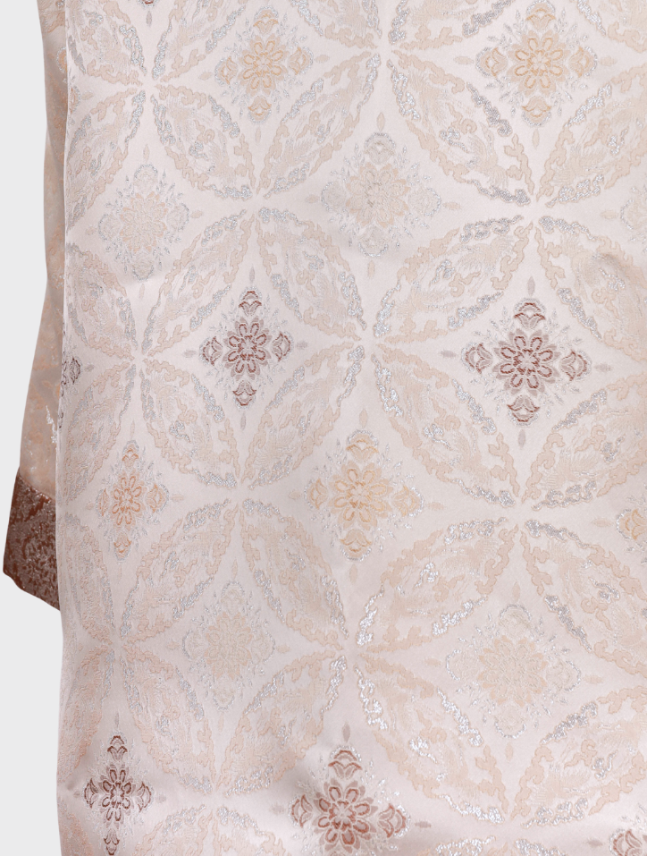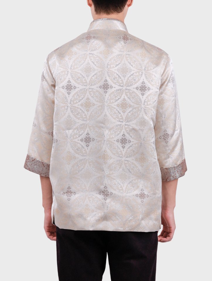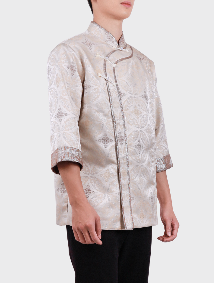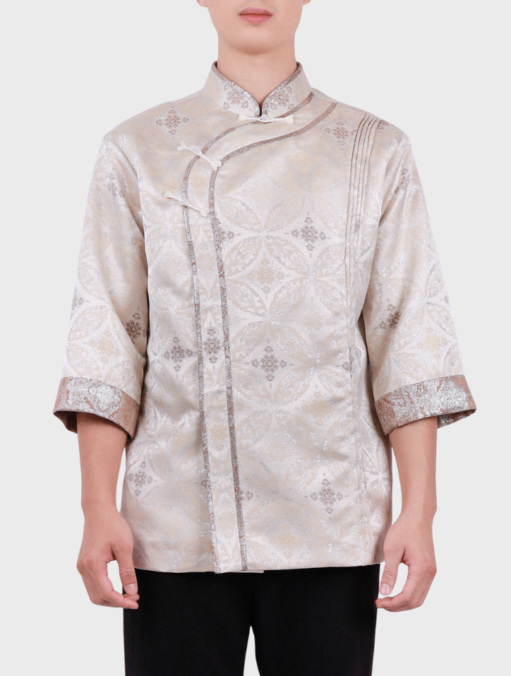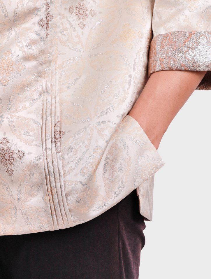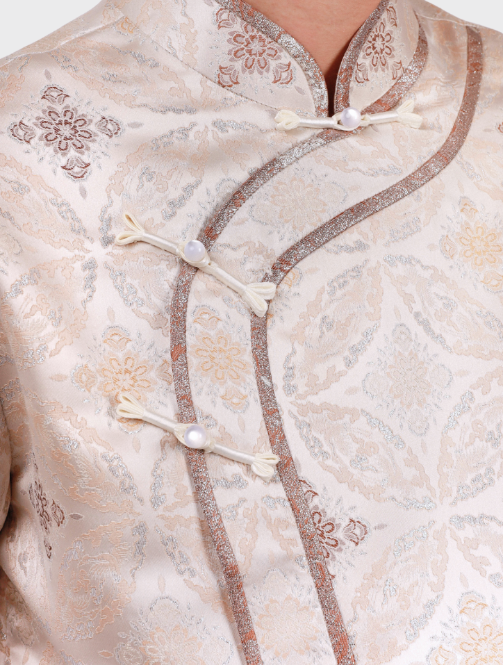 Er Tai in Rose Gold crafted from elegant jacquard fabric in a radiant rose gold hue. It features a Mandarin collar with piping, a front opening with traditional Chinese frog fasteners, and delicate pintuck detailing. The 3/4 sleeves are finished with folded panels, while the interior is lined with smooth satin silk and structured with shoulder pads for a refined finish.