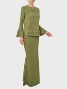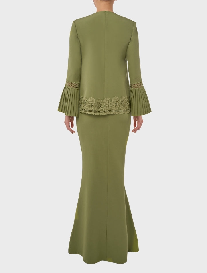 Erma in Olive Green is delicate and refined, featuring a round neckline with intricate fagotting lace on the body and hem. 3/4 pleated sleeves with matching lace and lace trimming add sophistication, while a slim mermaid-cut skirt creates a graceful silhouette. Lined with silky satin on the body and finished with a hidden back zip and hook fastening, it offers a seamless, elegant look.