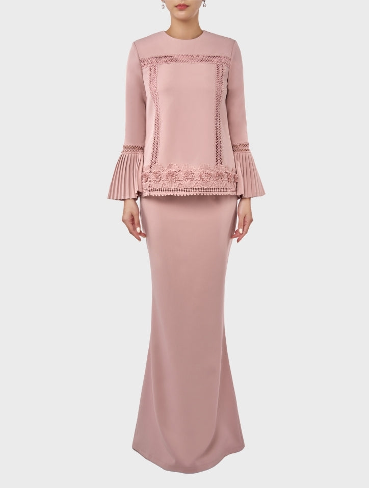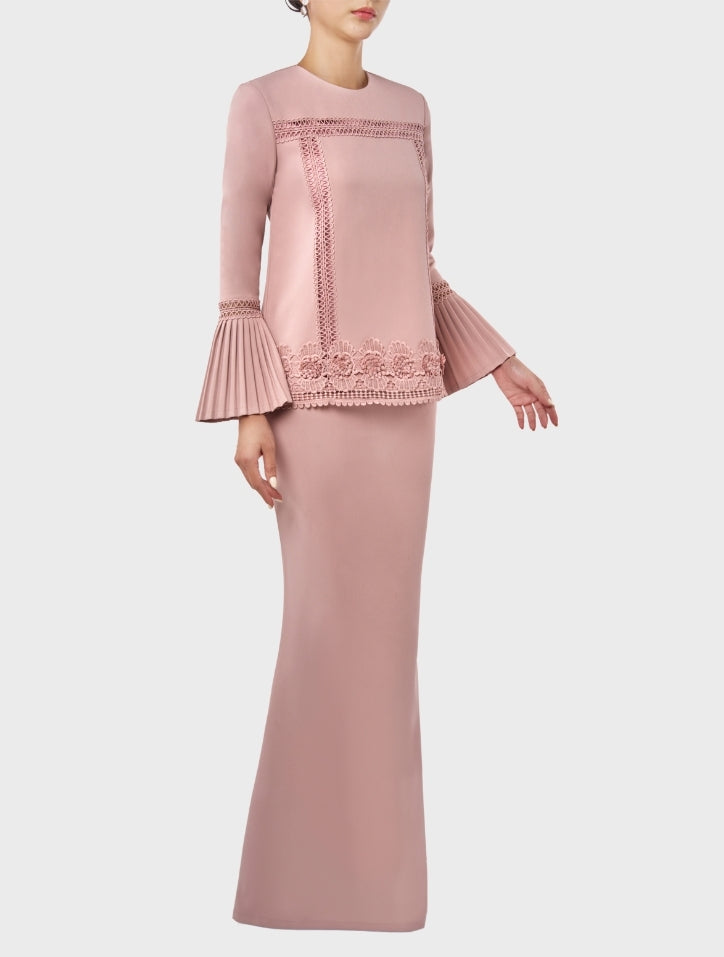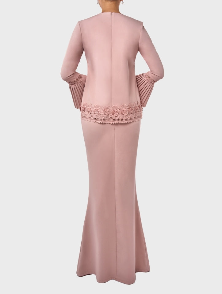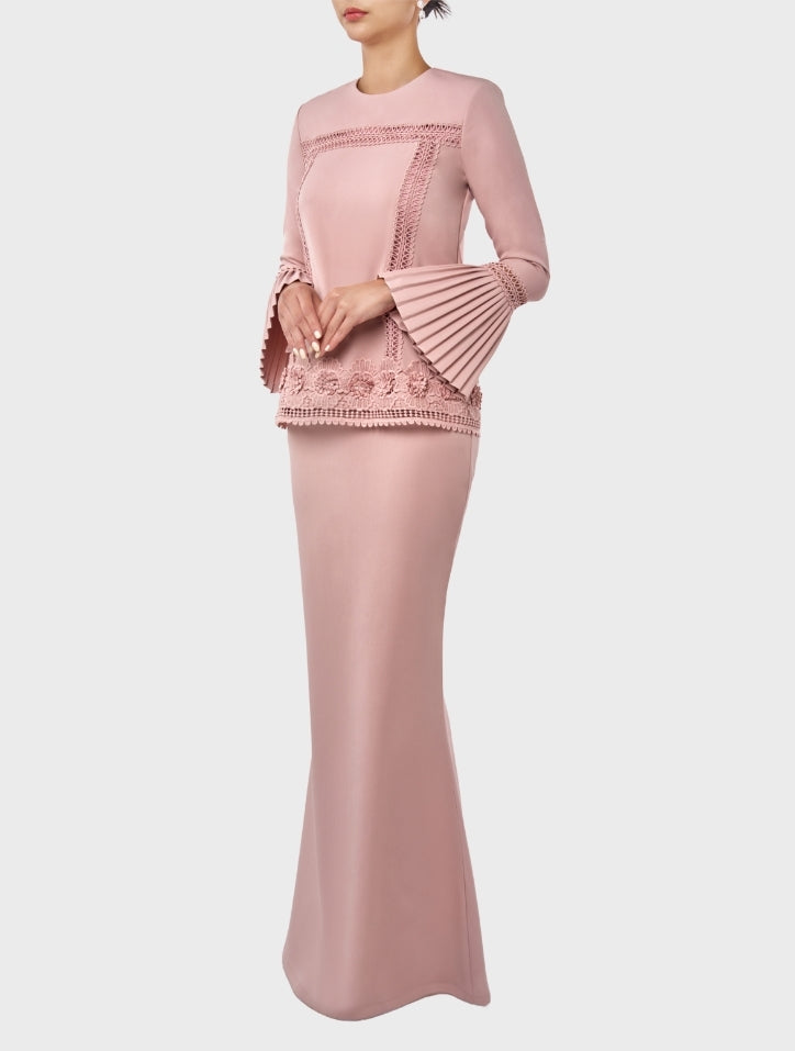 Erma in Rose Pink is delicate and refined, featuring a round neckline with intricate fagotting lace on the body and hem. 3/4 pleated sleeves with matching lace and lace trimming add sophistication, while a slim mermaid-cut skirt creates a graceful silhouette. Lined with silky satin on the body and finished with a hidden back zip and hook fastening, it offers a seamless, elegant look.