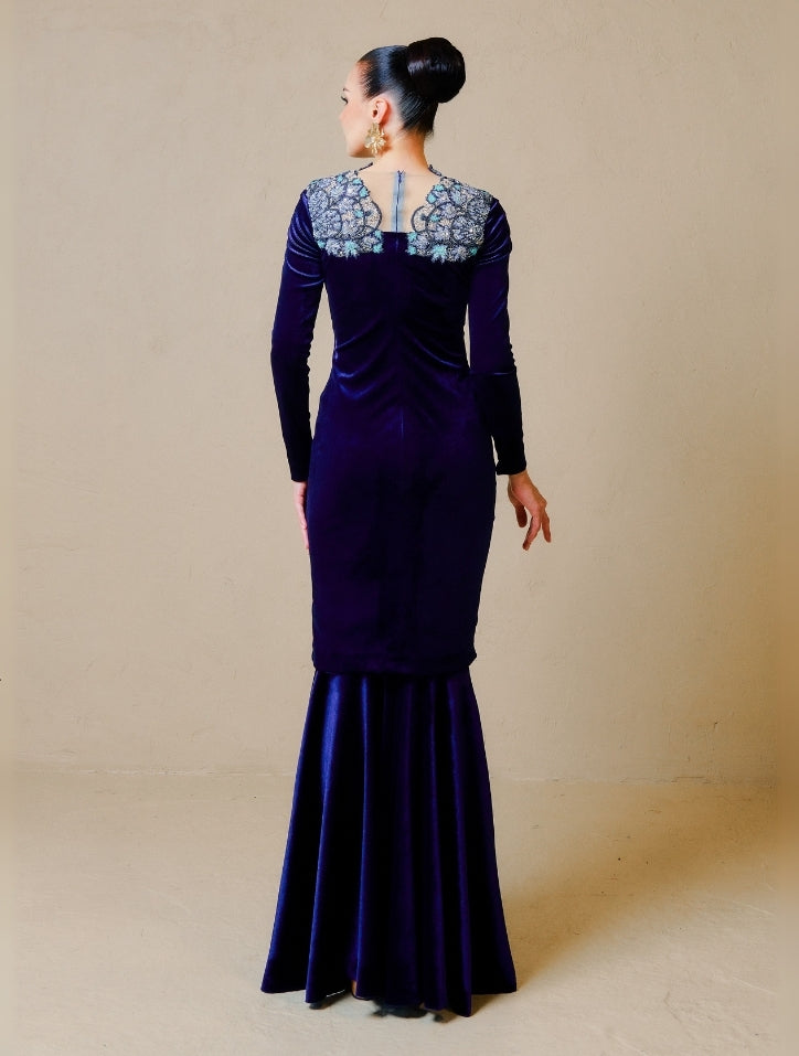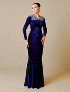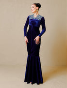 Sara is crafted from luxurious fabric adorned with intricate tambour beadwork on the shoulder panel. The material drapes beautifully with a smooth silk satin lining, The look is completed with a mermaid-cut skirt, creating a graceful, flowing silhouette with timeless sophistication.