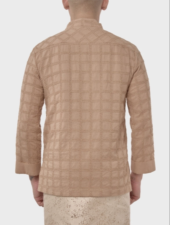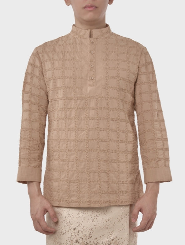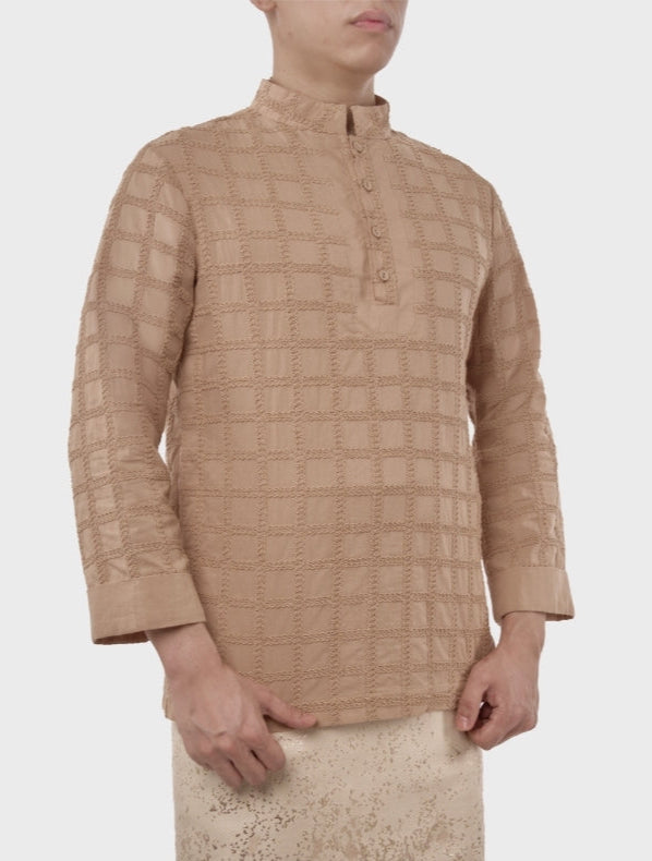 This Fadza in Light Brown is crafted from premium fabric and lined with smooth silk satin, offering all-day comfort and a refined finish. Featuring a Cekak Musang stand collar with matching buttons, hidden side pockets, and side slits, it blends timeless classic style with modern elegance.