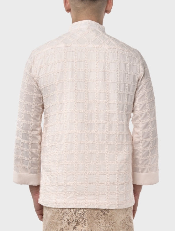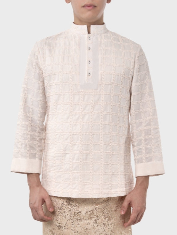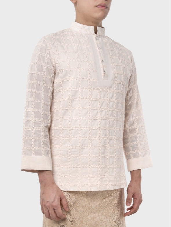 Fadza in Seashell White design is crafted from premium fabric and lined with smooth silk satin, offering comfort and a refined finish. Featuring a Cekak Musang stand collar with matching buttons and hidden side pockets, it blends timeless classic style with modern elegance.
