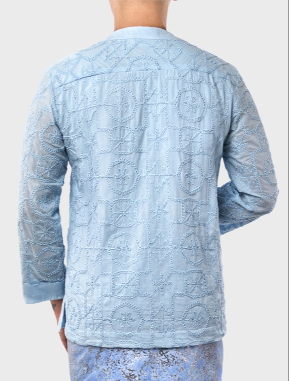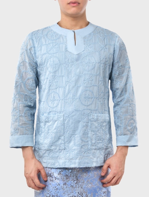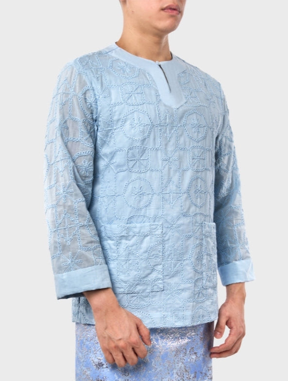 Faiz in Baby Blue is crafted from premium fabric and lined with smooth silk satin, offering a perfect balance of comfort and refined finish. Featuring a Teluk Belanga round collar with matching buttons, dual patch pockets, and side slits, it blends modern ease with timeless style.