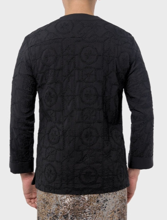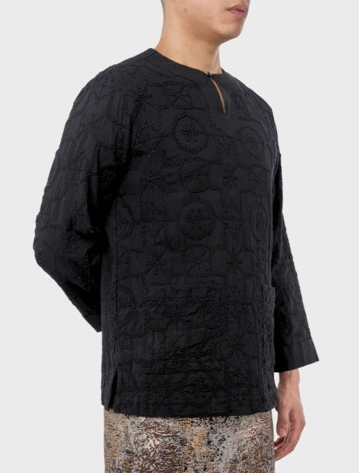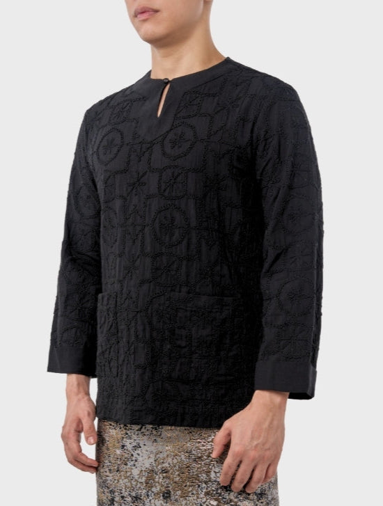 Faiz in Black is crafted from premium fabric and lined with smooth silk satin, offering a perfect balance of comfort and refined finish. Featuring a Teluk Belanga round collar with matching buttons, dual patch pockets, and side slits, it blends modern ease with timeless style.