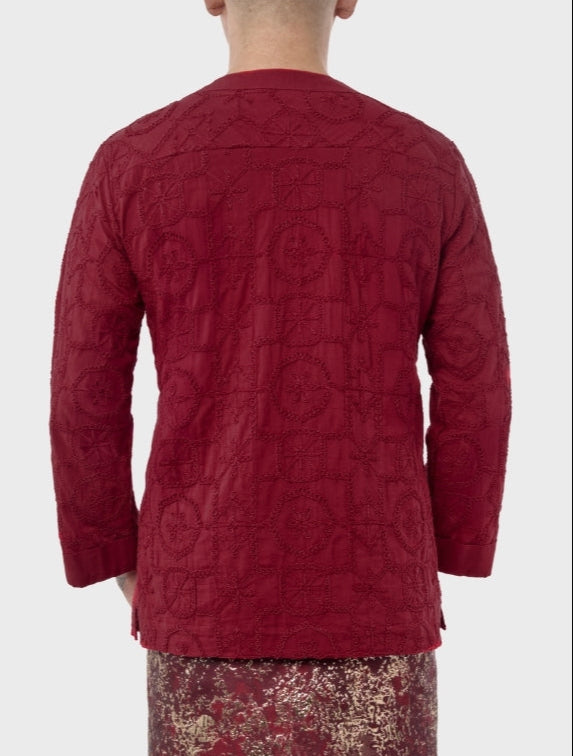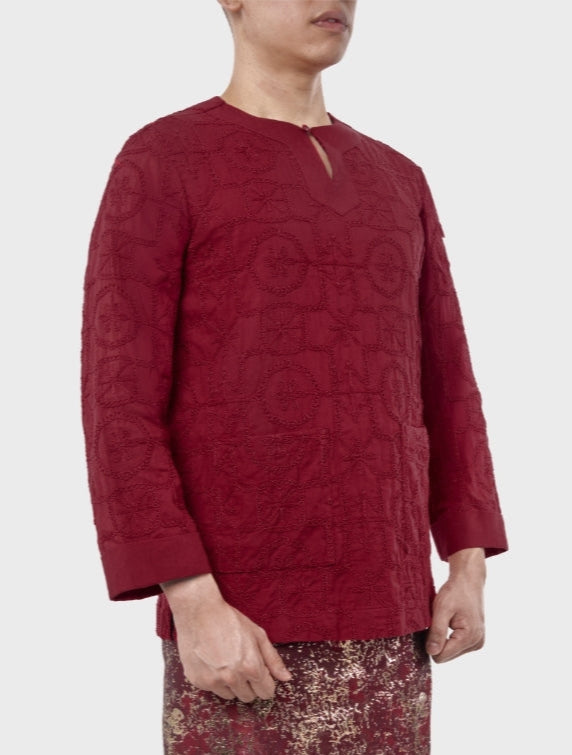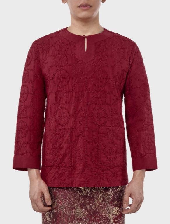 Faiz in Blood Red is crafted from premium fabric and lined with smooth silk satin, offering a perfect balance of comfort and refined finish. Featuring a Teluk Belanga round collar with matching buttons, dual patch pockets, and side slits, it blends modern ease with timeless style.