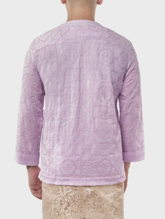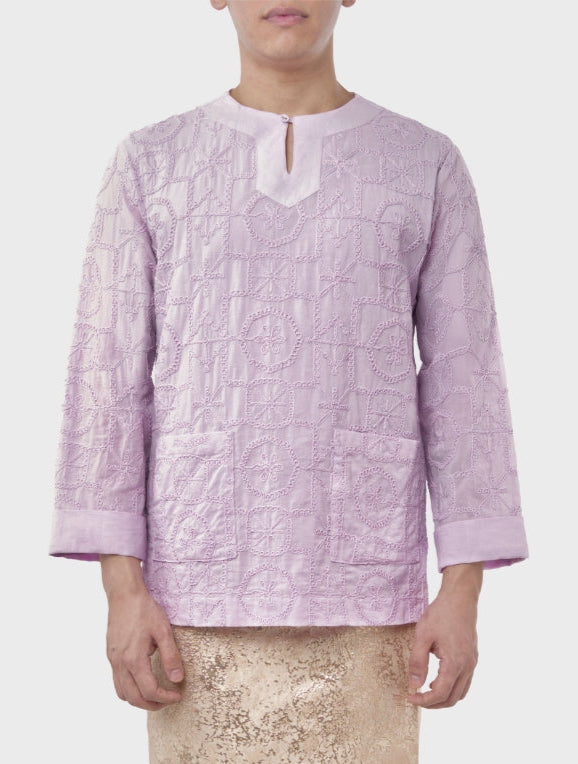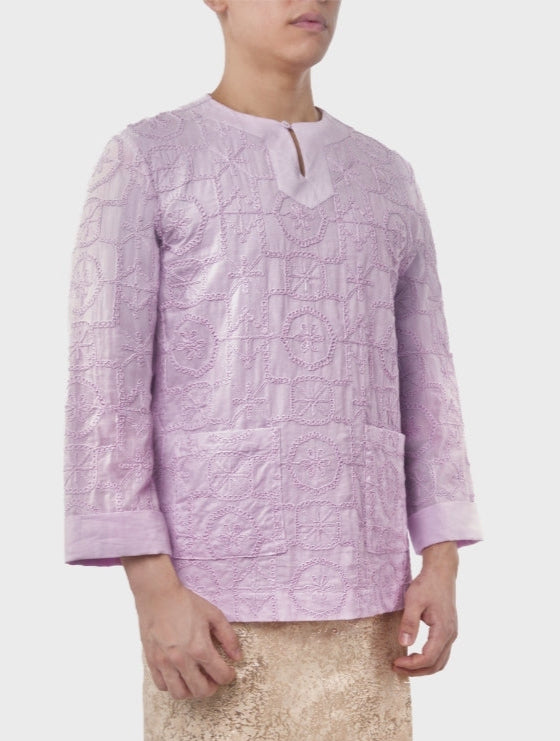 Faiz in Light Lilac is crafted from premium fabric and lined with smooth silk satin, offering a perfect balance of comfort and refined finish. Featuring a Teluk Belanga round collar with matching buttons, dual patch pockets, and side slits, it blends modern ease with timeless style.