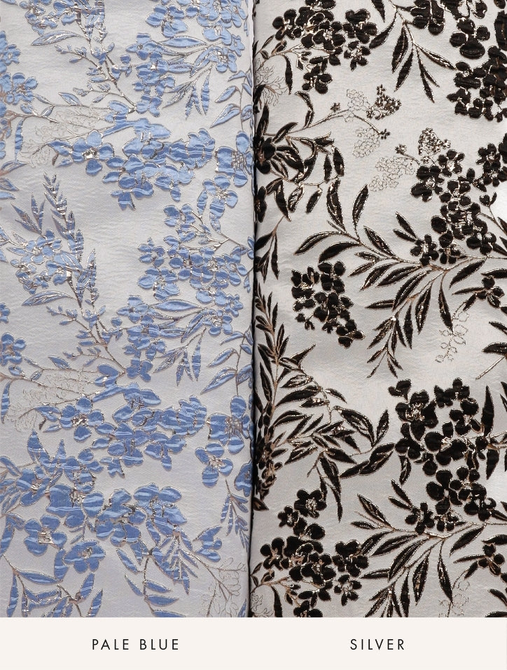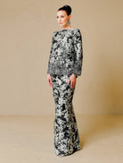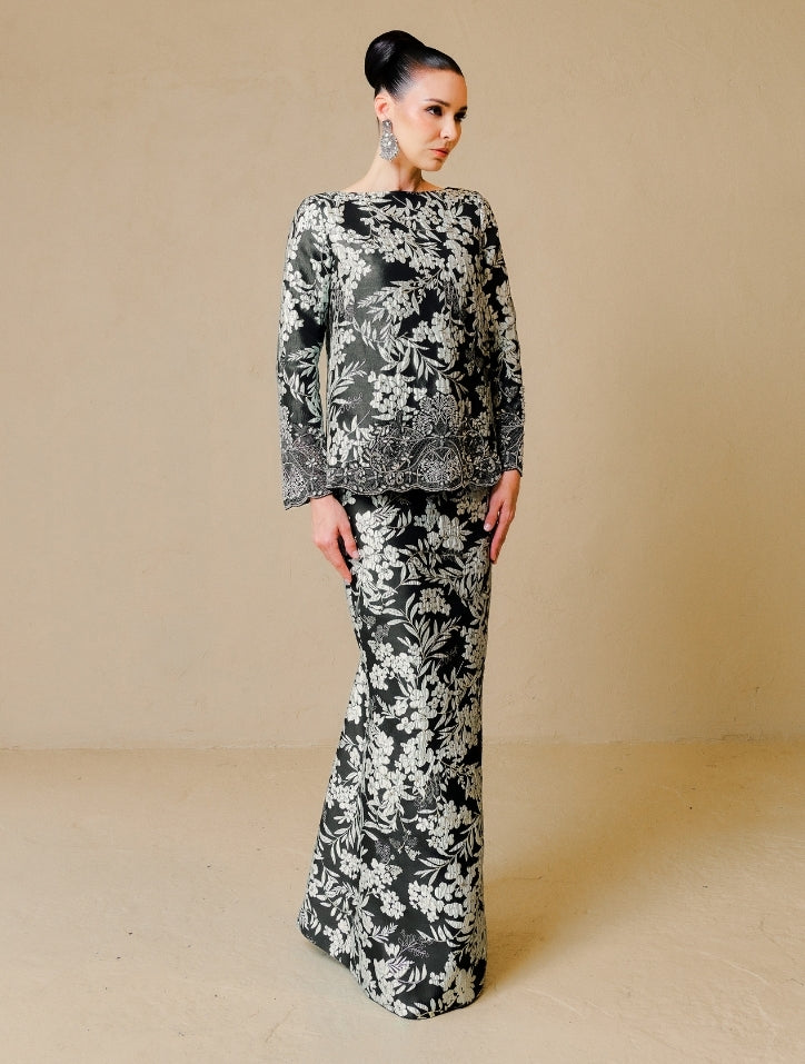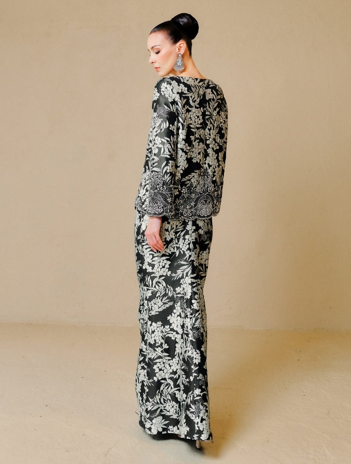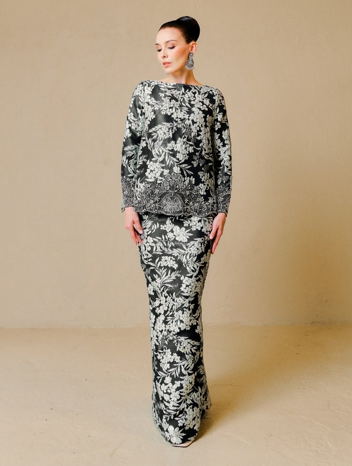 Farisah is crafted from luxurious fabric adorned with delicate tambour beadwork along the hemline and sleeves. The material drapes gracefully with a smooth silk satin lining, offering comfort and a refined, elegant finish. Completed with a pencil-cut skirt, this design exudes effortless sophistication.