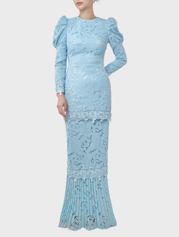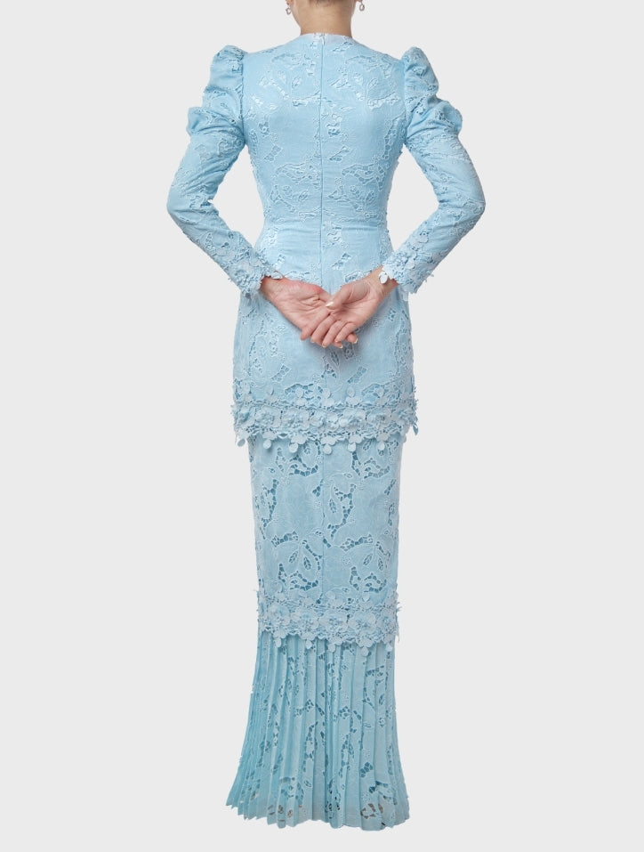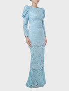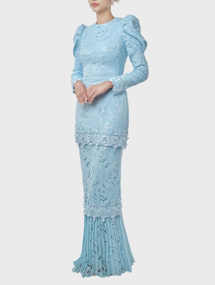 Fazura in Baby Blue is timeless and graceful, featuring a round neckline with full embroidery lace and fagotting lace along the hem. Puff shoulder sleeves with matching lace accents and intricate lace trimming add sophistication, while a tiered mermaid-cut skirt creates a flowing, feminine silhouette. Lined with silky satin and finished with a hidden back zip and hook fastening, it offers a seamless, refined look.