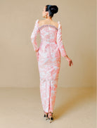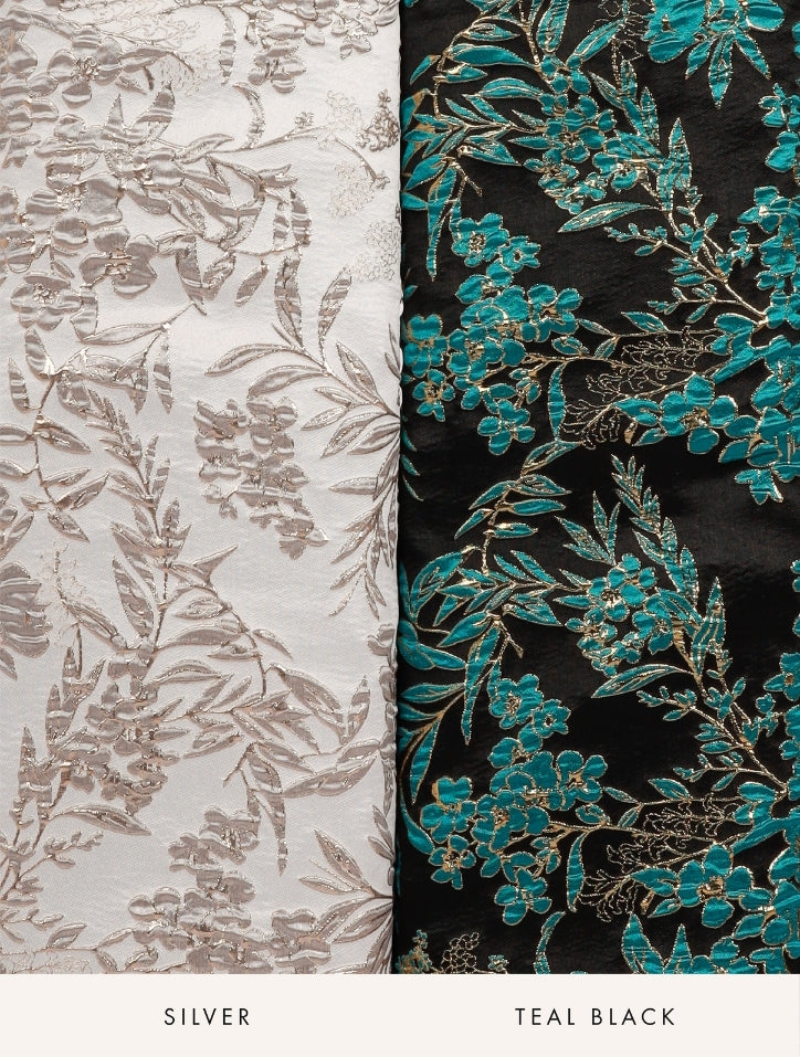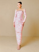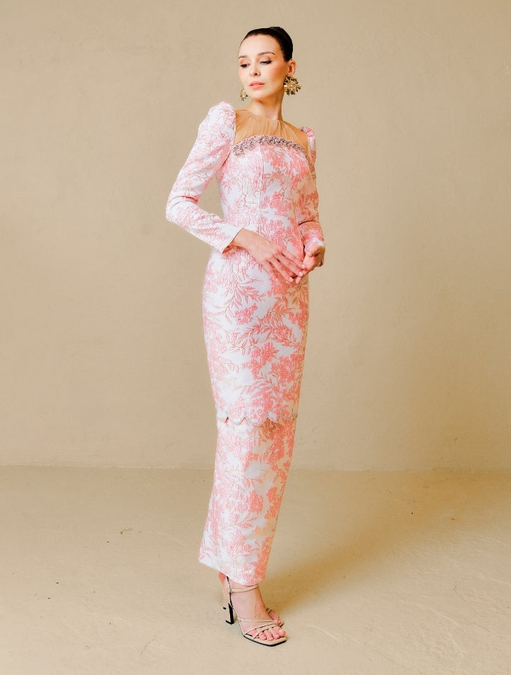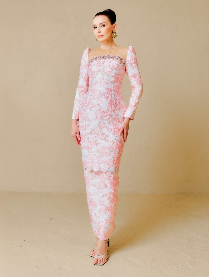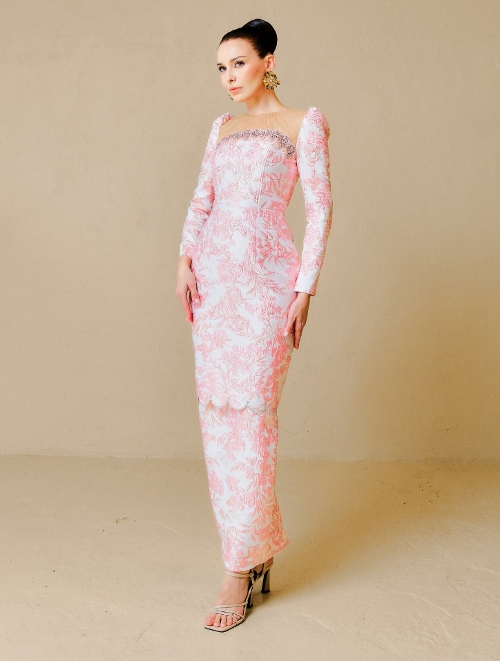 Fieza is crafted from luxurious fabric featuring a delicate ruched net overlay, intricate tambour beadwork, and scallop embroidery. The material is lined with smooth silk satin. The look is completed with a pencil-cut skirt, exuding timeless elegance and modern refinement.