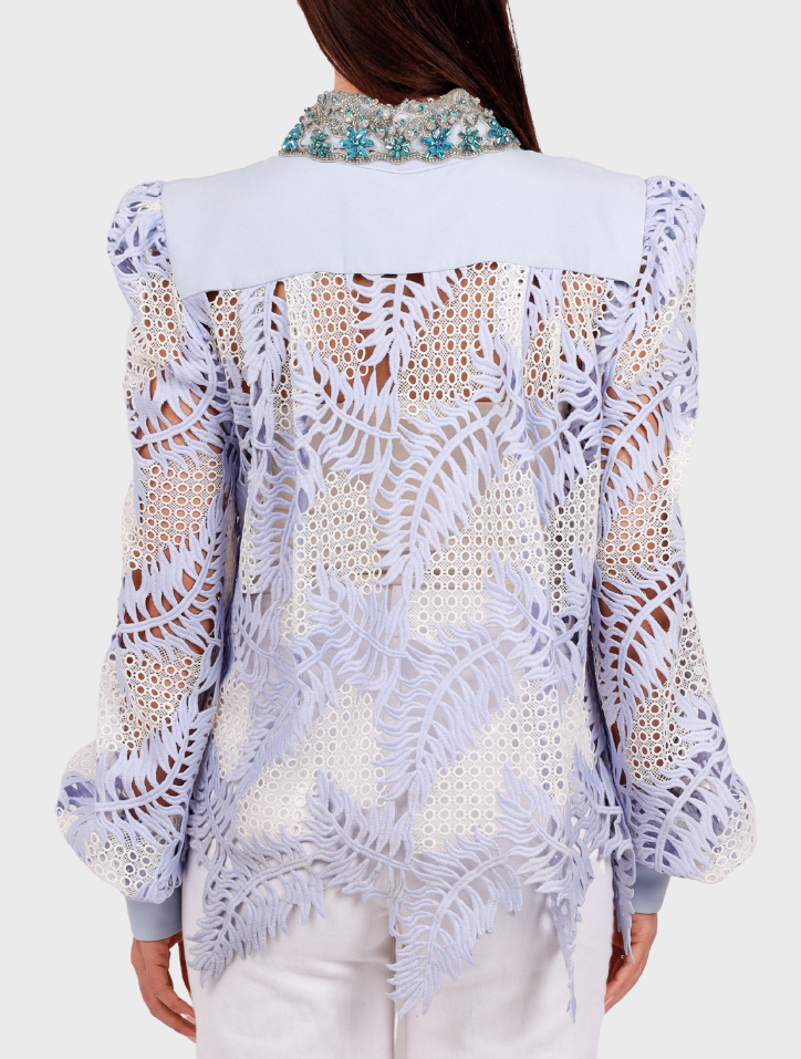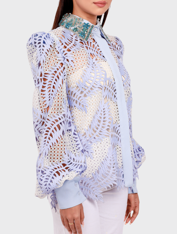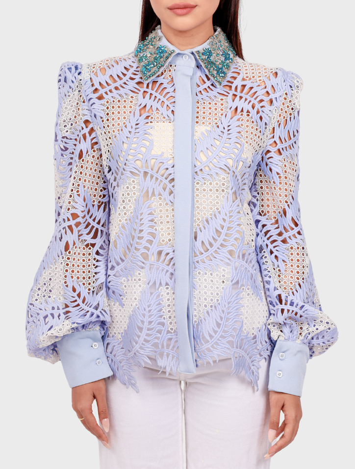 Presented in a striking Indigo Blue hue, our Florence blouse features a delicate self-portrait design with intricate cotton guipure and embellished collar. The elegant puff sleeves are accented with a chic cuff, while the comfortable fit and high-quality fabrics make it a must-have addition to our exclusive collection. Mesh glitter net lining and a front opening add a touch of sophistication to this statement piece.