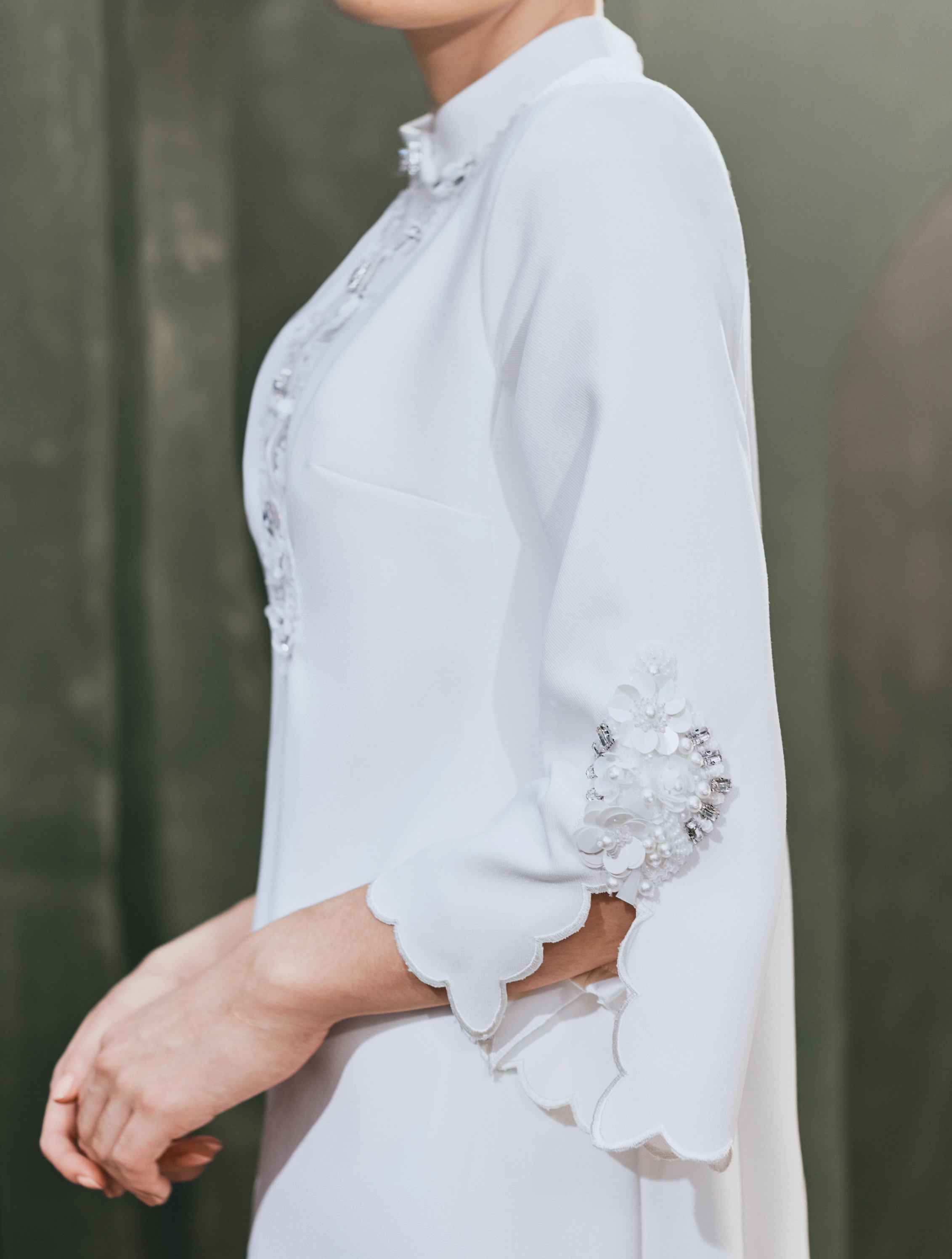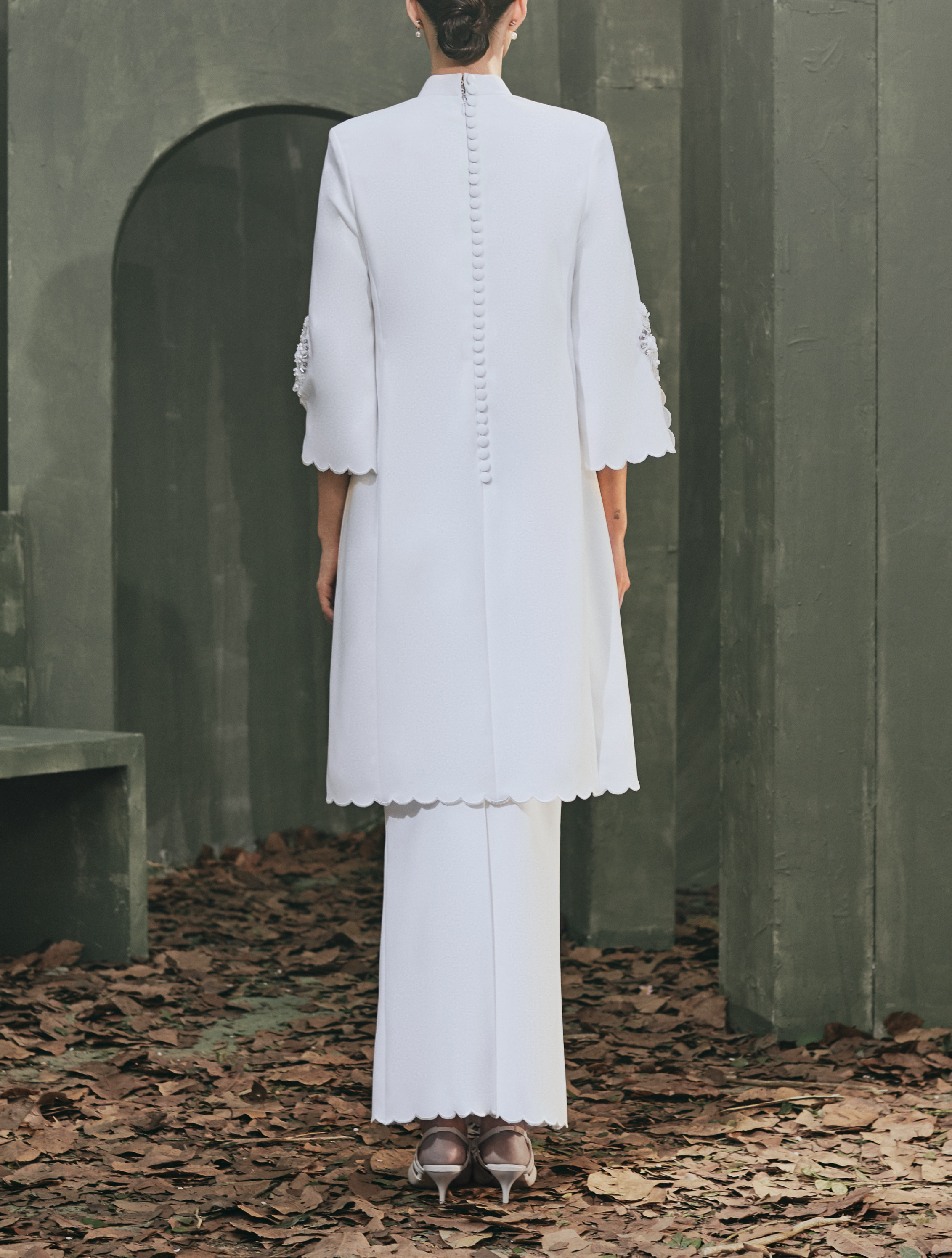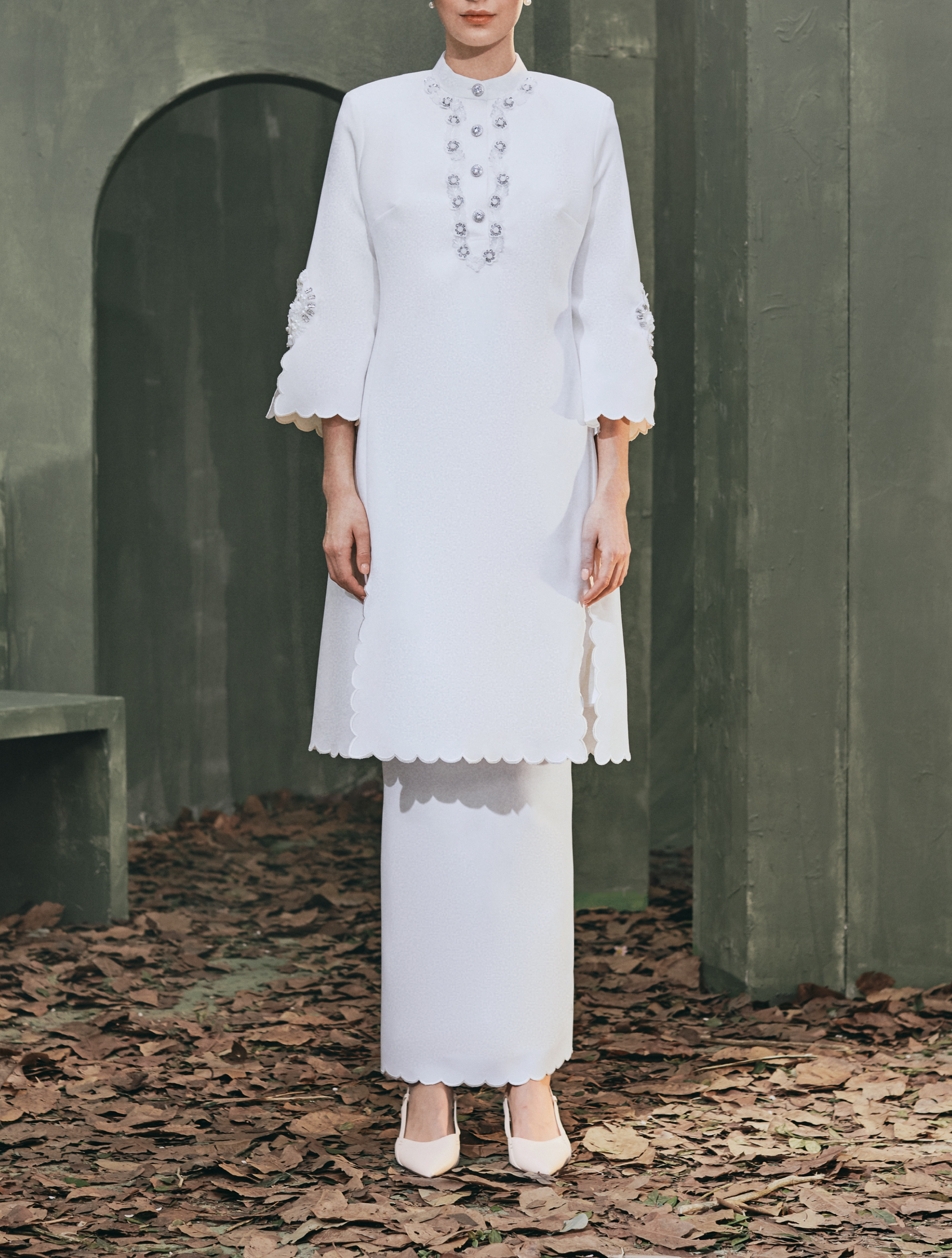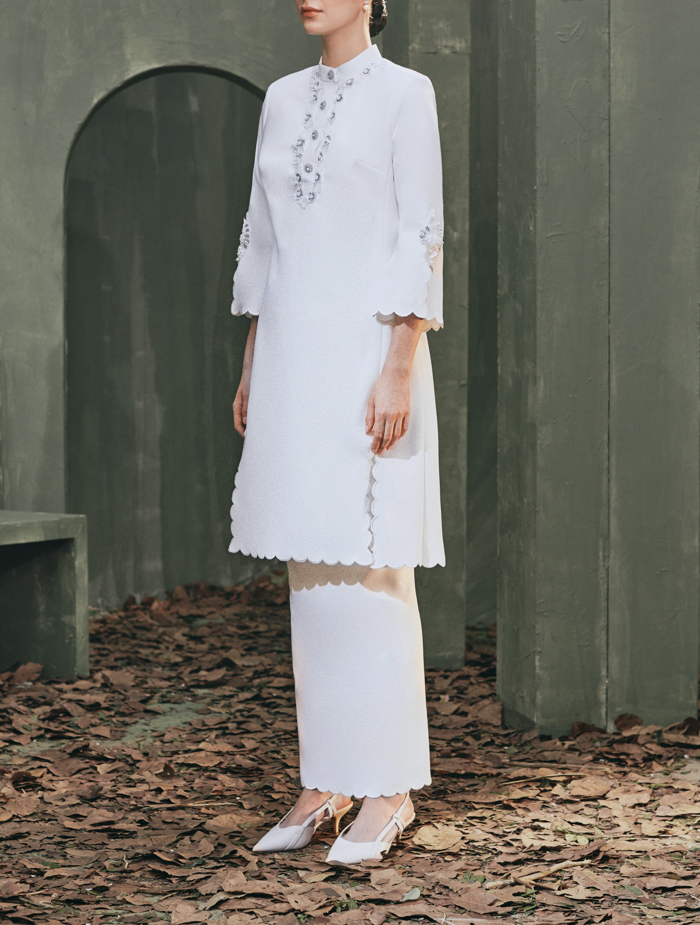 The Gabriella Modern Kurung is styled with a mandarin collar embellished with buttons and delicate beadwork. Its 3/4 sleeves are accented with slit embroidery and beads, while the kurung Pahang design is enhanced with intricate embroidery and decorative mushroombuttons. Paired with a cotton-polyblend pencil skirt featuring an elastic waistband, hidden back zipper, and hook closure, this fully lined set in ivory white balances tradition with modern elegance.