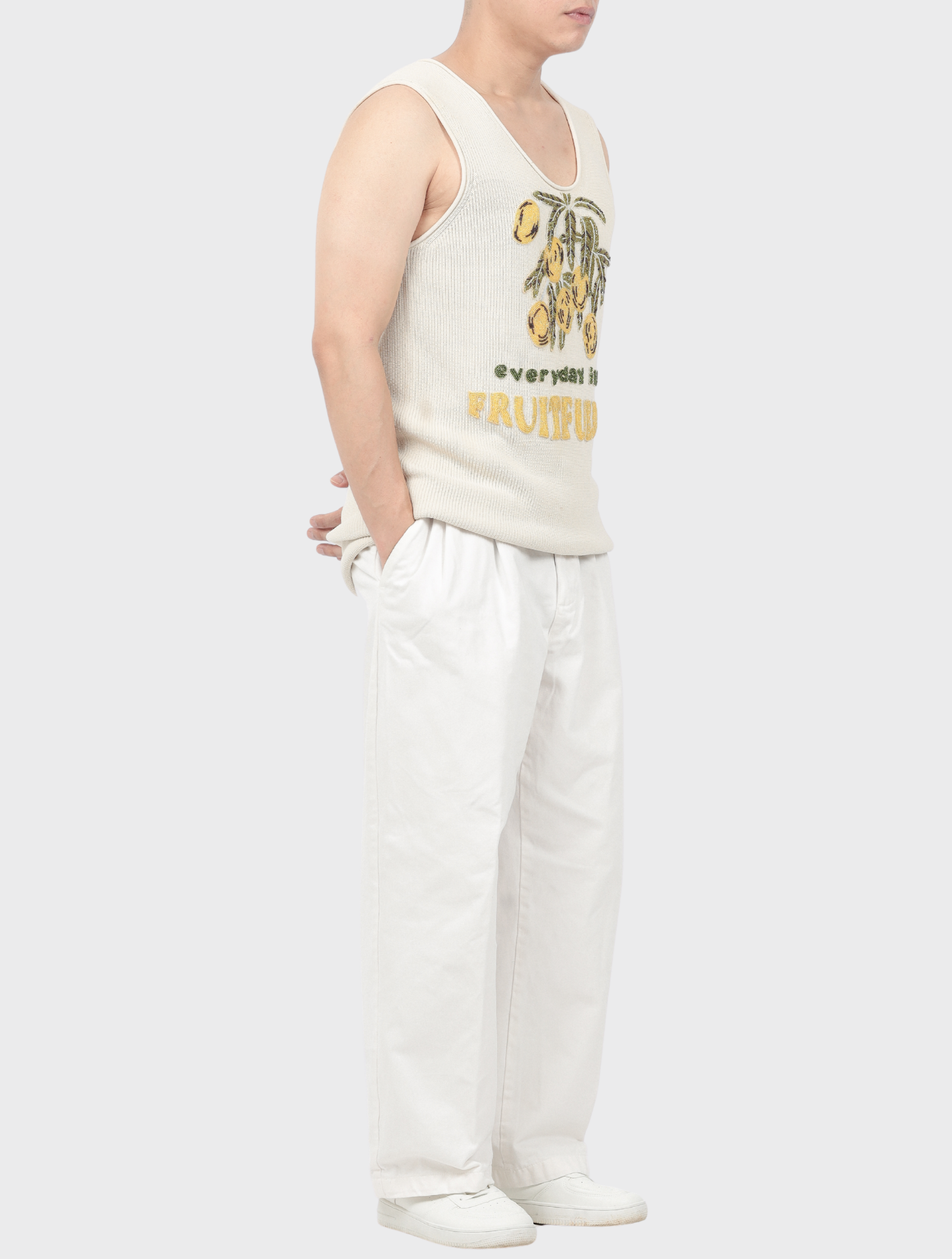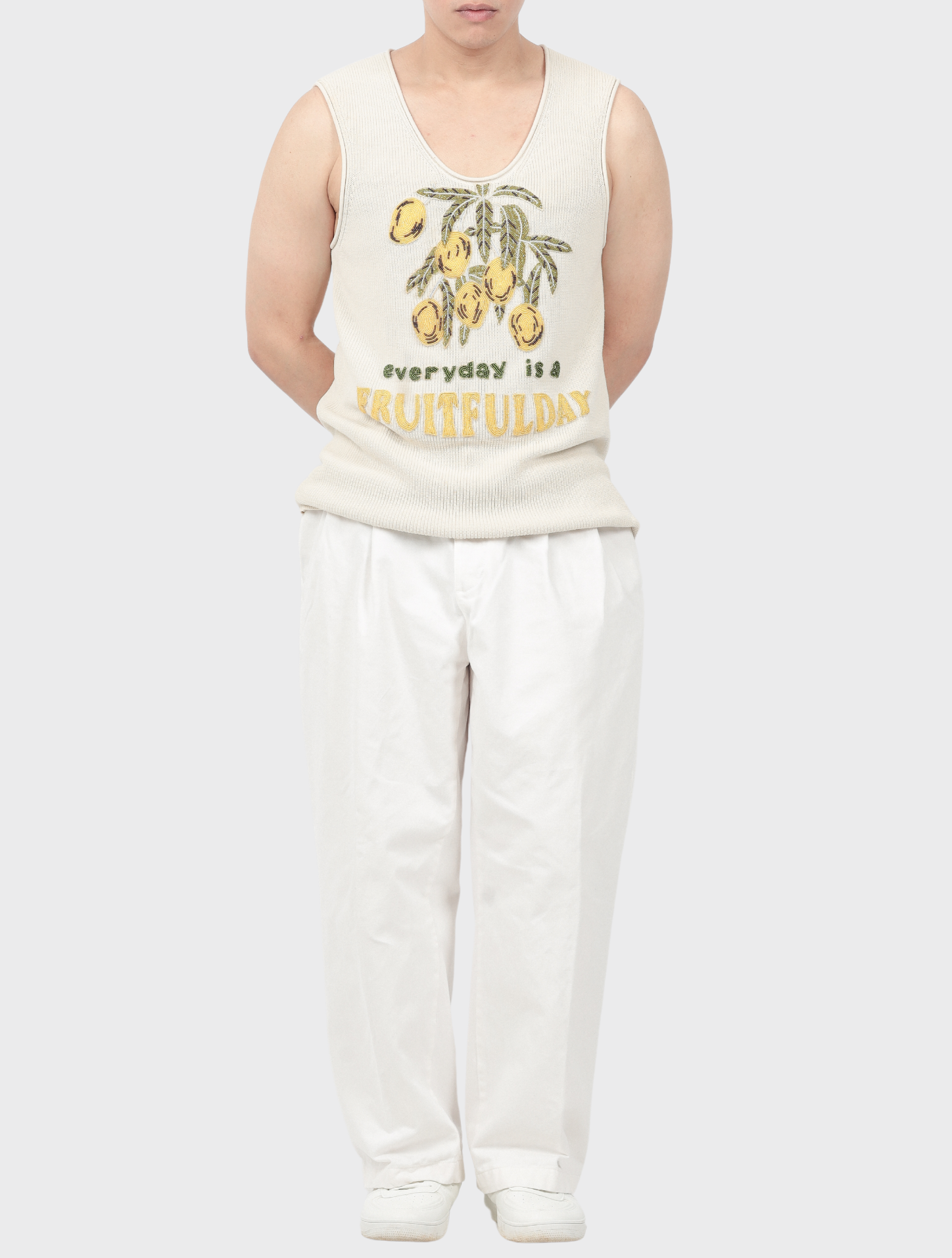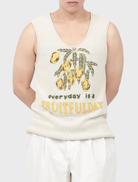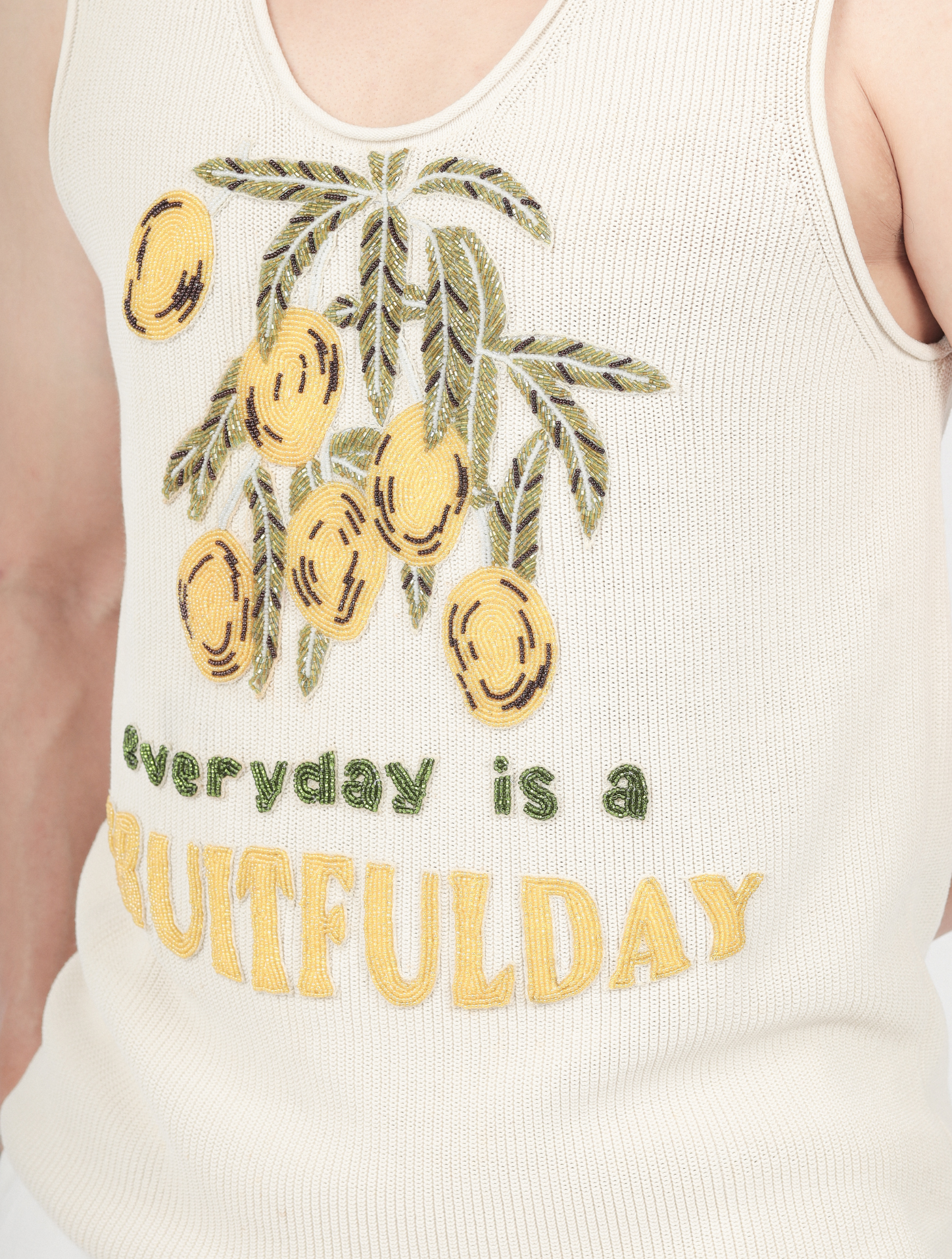 Crafted from premium cotton knit, this beige cream tank top offers a smooth, breathable texture with natural stretch for effortless comfort. Adorned with intricate hand embroidery, tambour beadwork, and mango appliqués, it features the original ‘FIZIWOO Harumanis’ pattern that celebrates artisanal craftsmanship. The unlined, regular-fit silhouette with a round neckline exudes timeless sophistication in a refined, modern form.