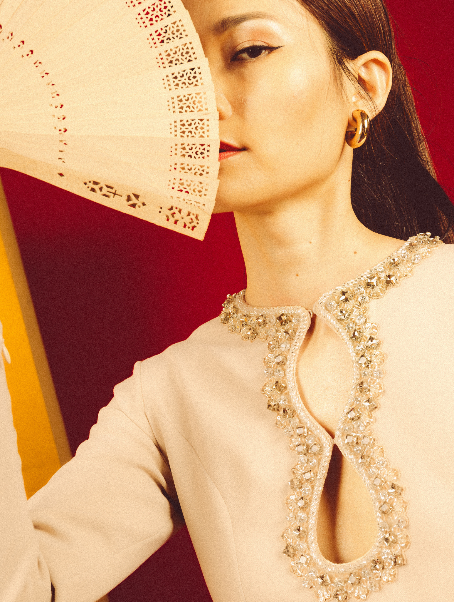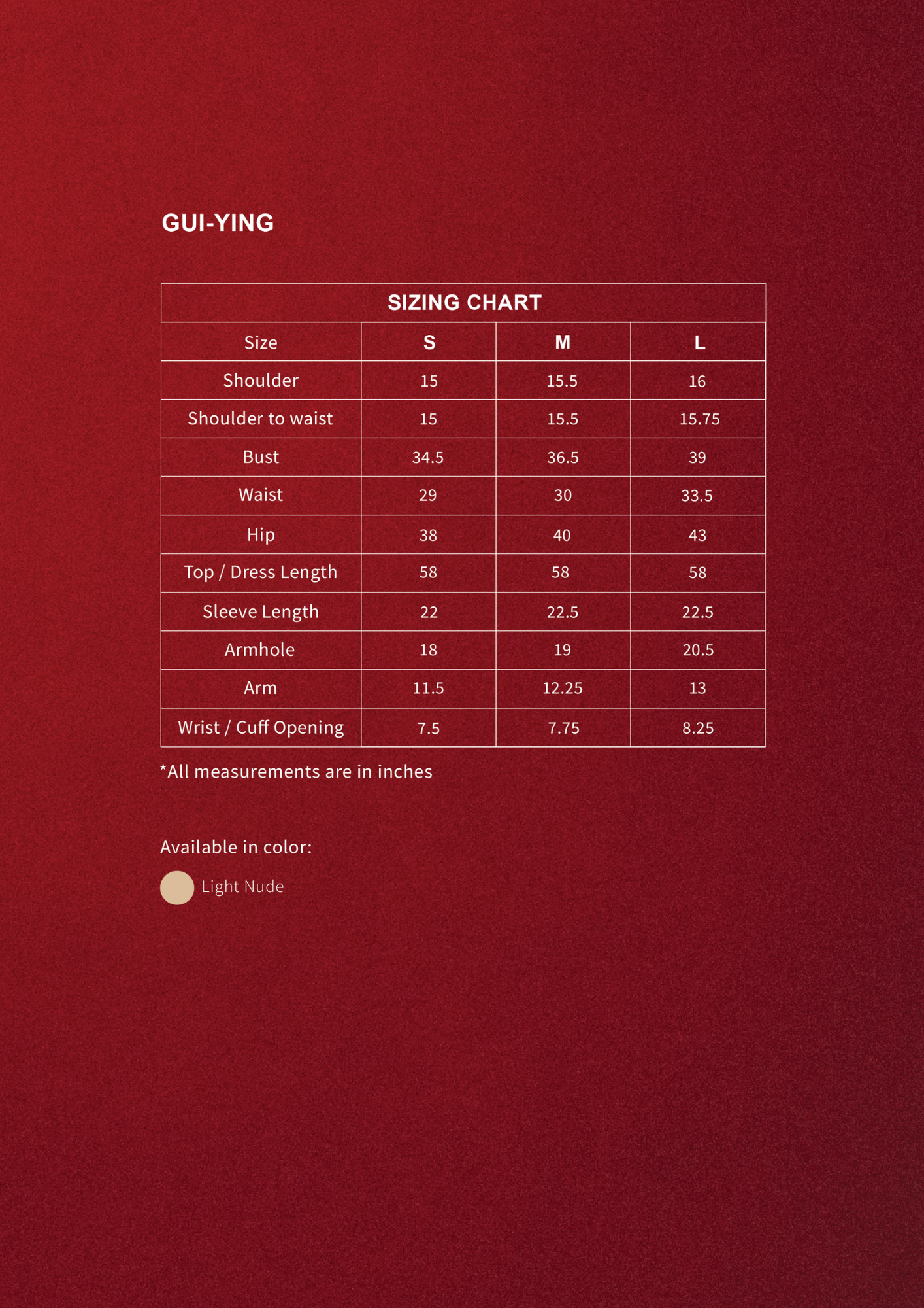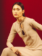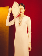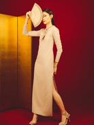 Gui-Ying in Light Nude is crafted from a luxurious cotton polyblend for a smooth, polished finish. It features fitted sleeves, a round collar, a double teardrop neckline with delicate bead embellishments, and an ankle-length silhouette. Fully lined and finished with a hidden back zip, this non-stretchable dress offers elegance and refined comfort.