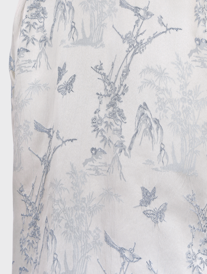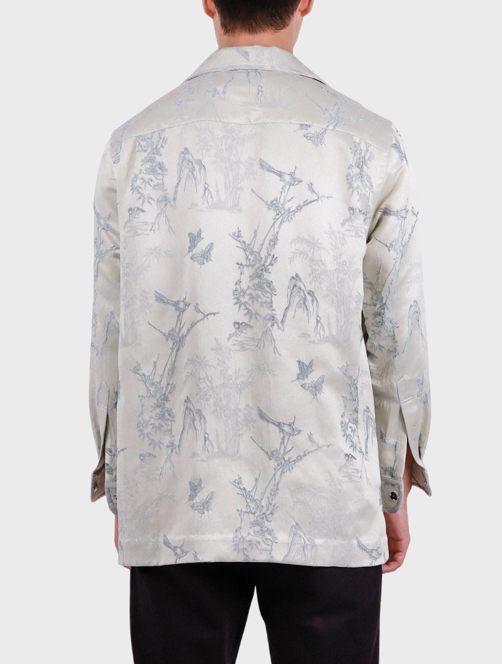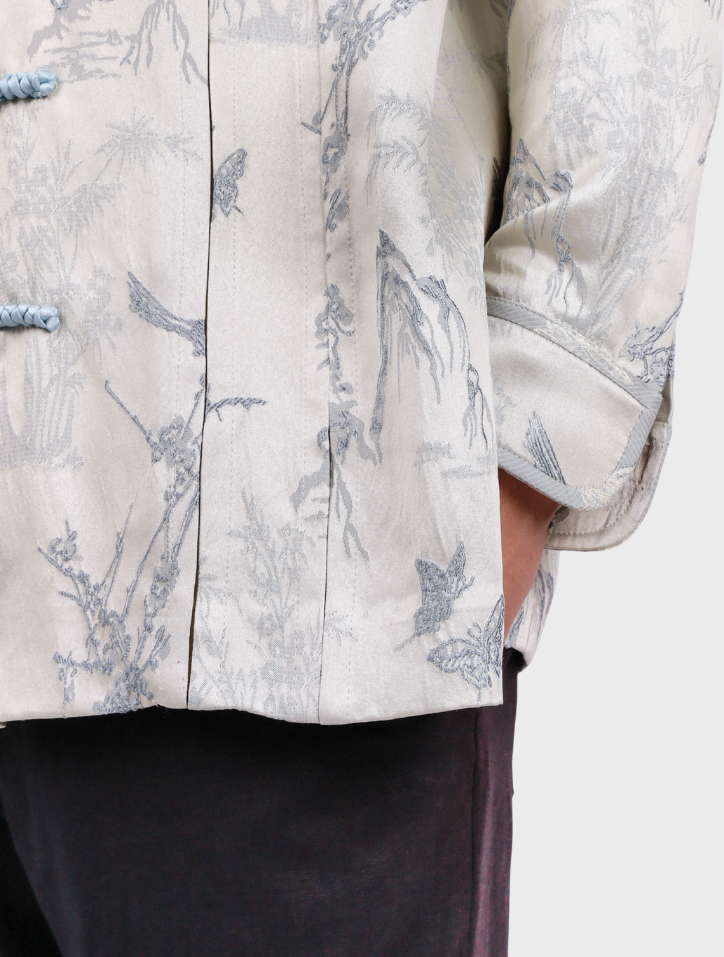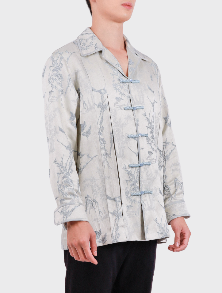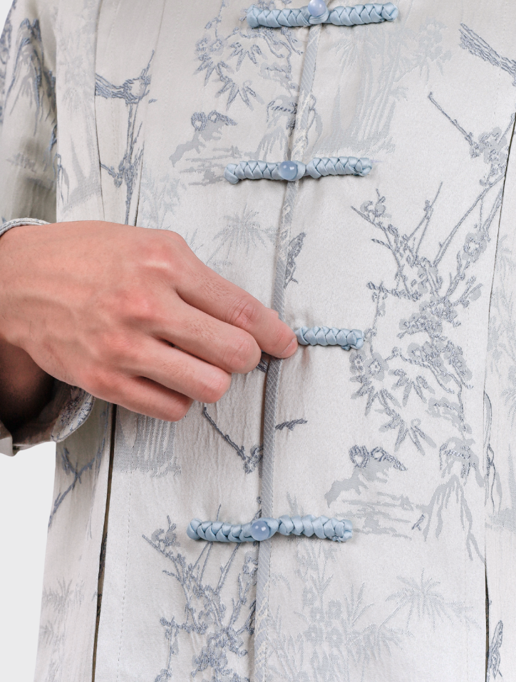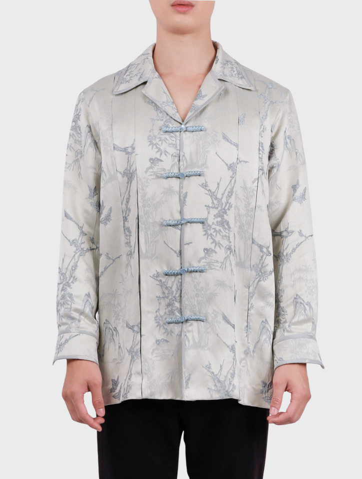 Han Yu in Silver Blue is crafted from elegant jacquard fabric in a sleek silver blue hue. It features a Hawaiian collar with piping, a front opening with a Chinese frog fastener, and box pleat detailing. The long sleeves are finished with cuffs and piping for a refined, polished look.