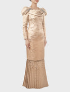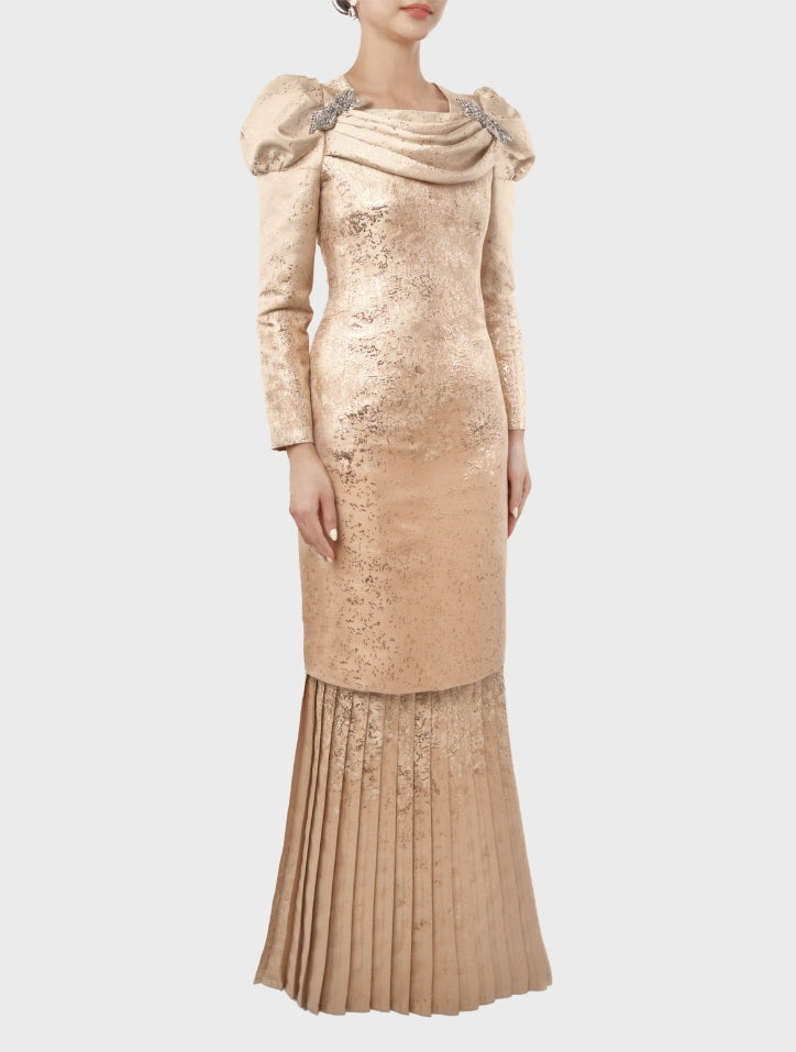 Hanis in Champagne is graceful and refined, featuring a soft cowl neckline with elegant draping and a beaded bow embellishment. Puff shoulder sleeves add volume, while a pleated mermaid skirt ensures graceful movement. Lined with silky satin and finished with a hidden back zip and hook fastening, it offers a seamless, polished fit.