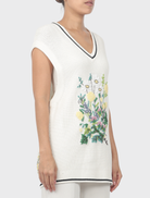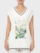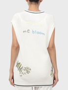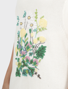 This sleeveless sweater vest top features stunning hand embroidery and shimmering tambour beads, meticulously woven together to form a sophisticated garden of grace and magic, embodying the beauty of blooming flowers in their untamed and vibrant state. The V-neckline, crochet knit, and elegant 'FIZIWOO Wild Flower' tambour bead patterns create an exquisite, relaxed fit design in an alluring Off White shade.