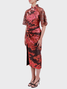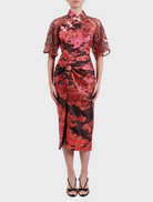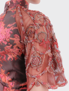 The Hong Yuan in Dark Mauve showcases extraordinary craftsmanship with painstaking hand-detailed work, refined silk brocades, artisanal jacquards, and delicate metallic embellishments—a sophisticated harmony of heritage and contemporary aesthetics. The distinguished ensemble features a jacquard top with an elegant Mandarin collar and traditional frog closures, sumptuously beaded raglan sleeves, and a precisely tailored silhouette, all enhanced with lustrous satin lining and discreet back fastening. The accompanying skirt presents an artfully twisted front drape, a graceful elastic waistband for comfort, and exquisite satin lining, all rendered in a captivating Dark Mauve palette that exudes refined elegance.