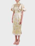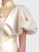 This Pastel Yellow piece is crafted from luxurious silk brocade and handwoven jacquard with subtle metallic accents. It features a Mandarin collar, delicate beadwork on the upper bust, and dramatic puff sleeves. The midi silhouette includes a side slit and is fully lined with silky satin, finished with a concealed back zipper.