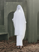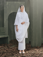 The Isla Organza Kerudung is cut from soft organza, designed with delicate scalloped embroidery for a timeless detail. Measuring 85 inches long and 27.5 inches wide, it offers generous styling versatility. Finished in ivory white, it creates a graceful and elevated appearance
