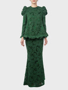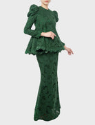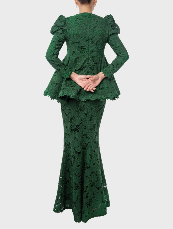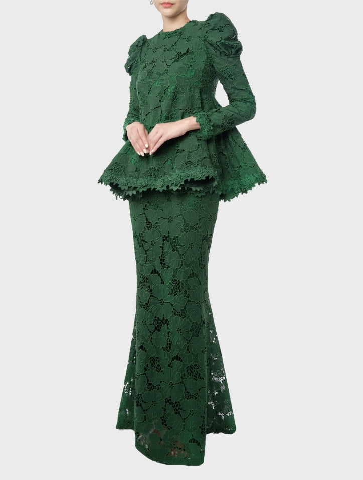Izzah in Emerald Green is timeless and elegant, featuring a round neckline with full embroidery lace and delicate fagotting lace on the hem. Puff shoulder sleeves with intricate lace accents and lace trimming add sophistication, while a mermaid-cut skirt ensures graceful movement. Lined with silky satin and finished with a hidden back zip and hook fastening, it offers a seamless, refined look.