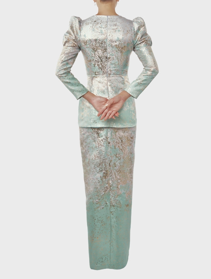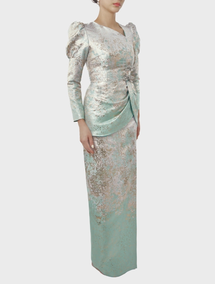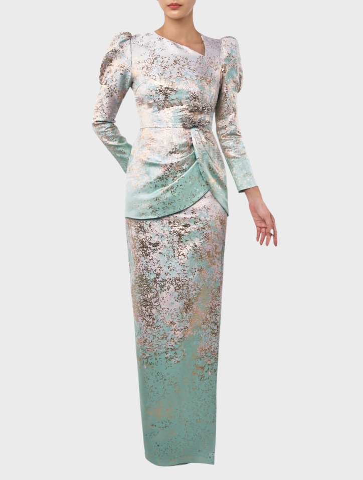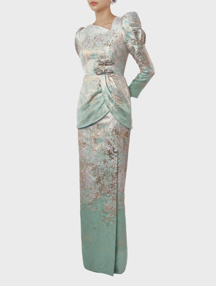Jaja in Tiffany Green is elegant with a modern twist, featuring an asymmetrical neckline with a beaded bow embellishment. Puff shoulder sleeves and an overlap drape peplum create a structured, flattering silhouette, while an overlap side pencil-cut skirt adds a sleek finish. Lined with silky satin and finished with a hidden back zip and hook fastening, it offers effortless elegance.