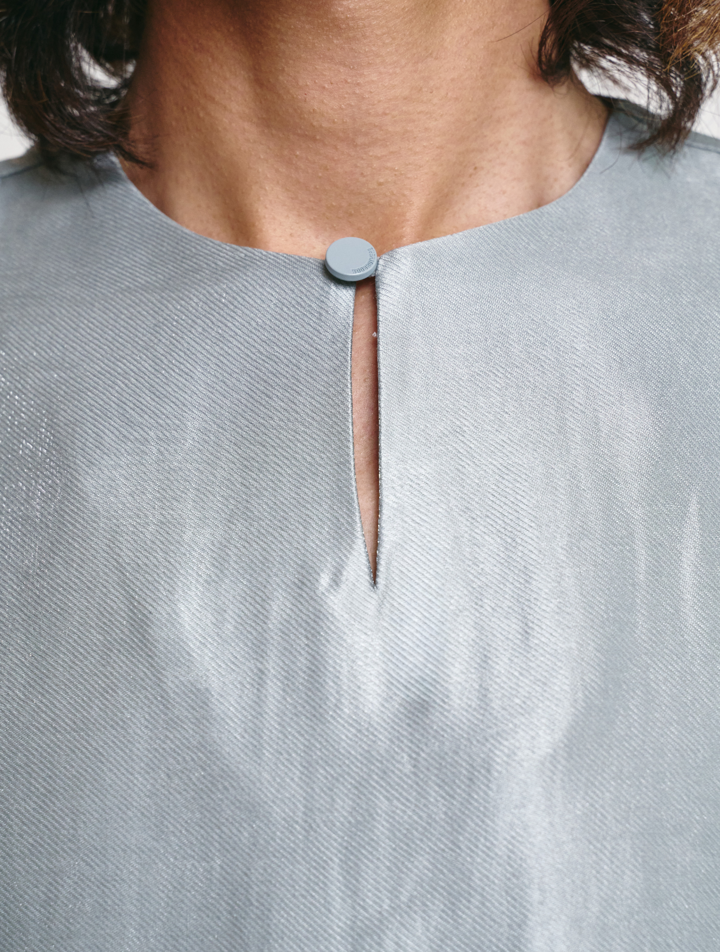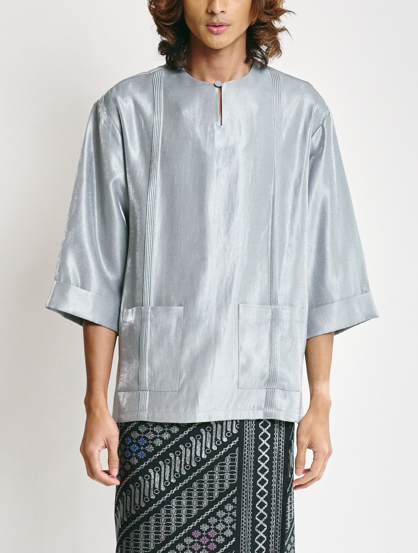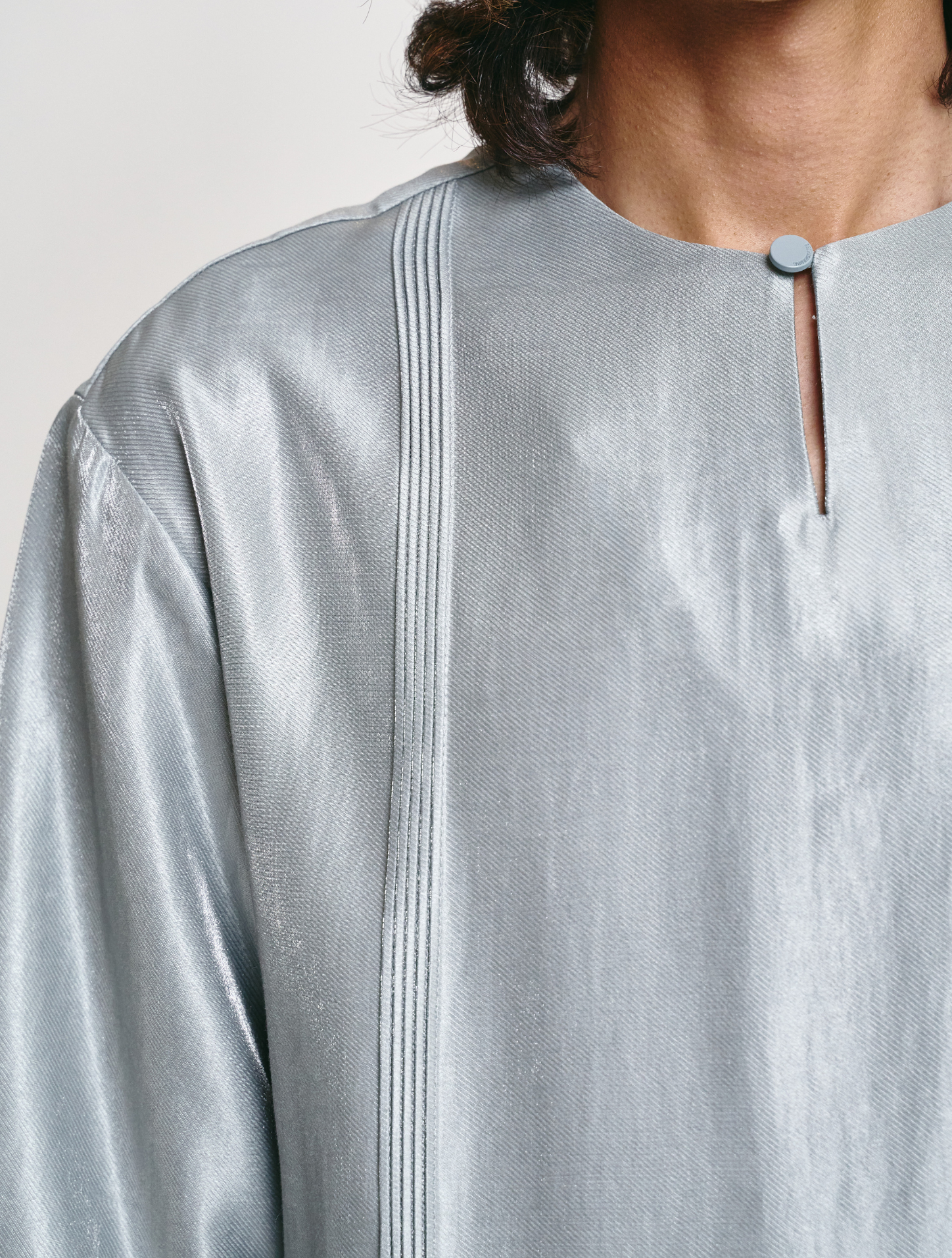 Johor, a modern interpretation of the classic Teluk Belanga Kurta. Designed for everyday wear, this piece features a traditional Teluk Belanga collar with button fastening, long sleeves with a folded hem, and two functional patch pockets detailed with pintuck accents and side slits. Finished with subtle logo embroidery at the back yoke. Cut in a regular fit and left unlined for a lightweight, breathable feel.