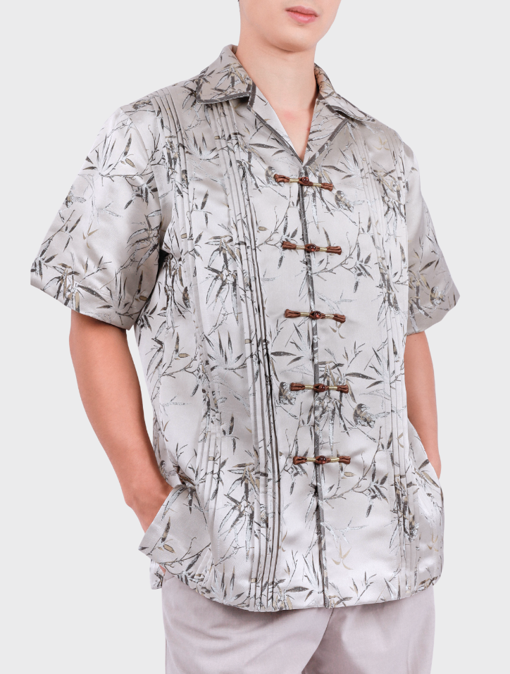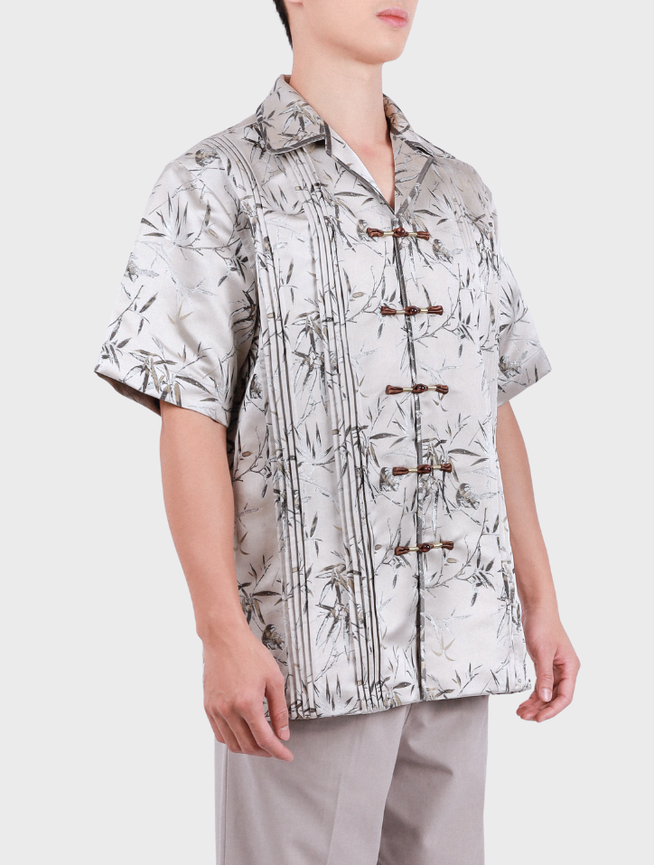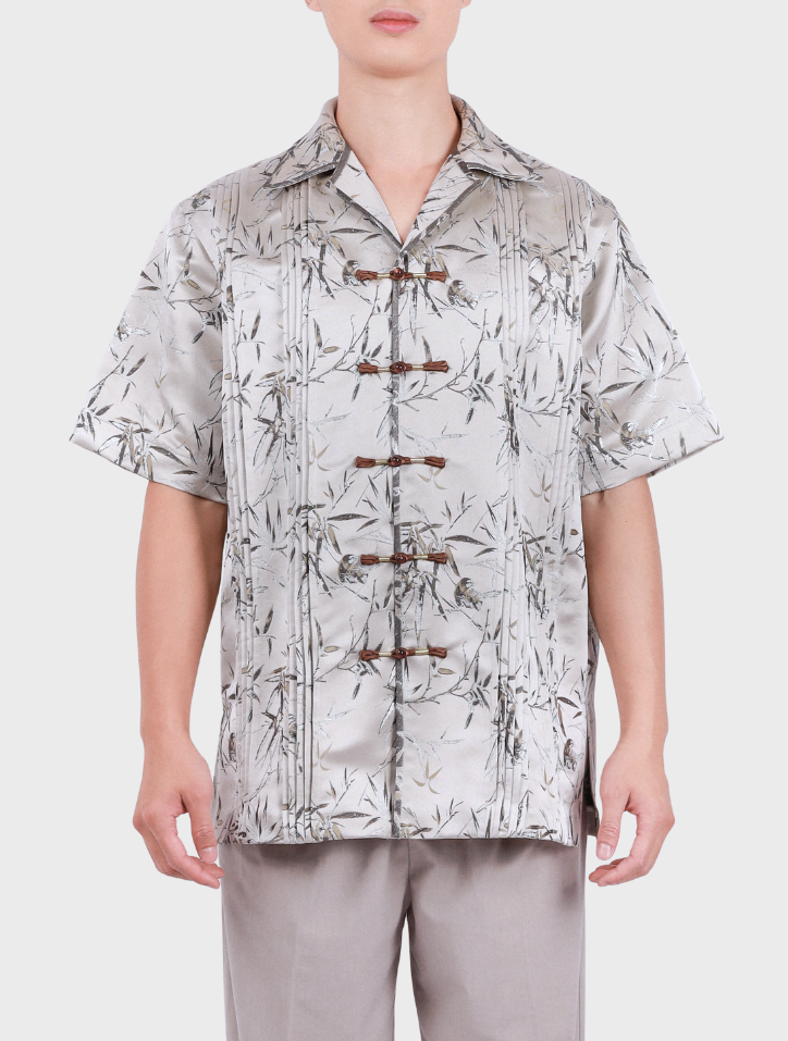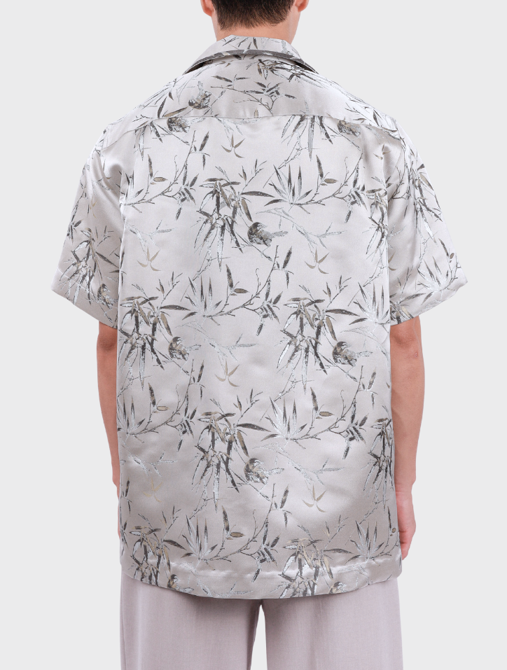 Kai in Silver is crafted from refined jacquard fabric in an elegant silver hue. It features a Hawaiian collar with precise piping, a front opening with matching piping and secure fastening, and delicate pintuck detailing. A thoughtfully placed patch pocket completes the look, adding a touch of understated luxury.